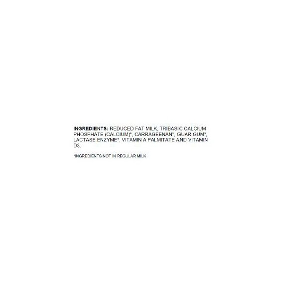 Details    Ingredients  Reduced Fat Milk, Tribasic Calcium Phosphate (Calcium)*, Carrageenan*, Gaur Gum*, Lactase Enzyme*, Vitamin A Palmitate and Vitamin D3.       Product features  Everybody’s favorite milk just got even better. Our 2% milk is packed with protein, vitamins, and 20% more calcium than you’ll find in regular milk. And it’s both 100% dairy, just without the lactose, so you can feel 100% confident drinking it anytime you want.     Lactaid® 100% Lactose Free 2% Reduced Fat Milk.   Enjoy milk again!.   Calcium enriched 50% daily value calcium per serving.   2% milk fat/38% less fat than whole milk.   Grade A. Vitamins A&D.   Ultra-pasteurized.   Real milk no discomfort!.   Half gallon (1.89L).       Special Features  Lactose free    Net Quantity of Content   8 X 8oz