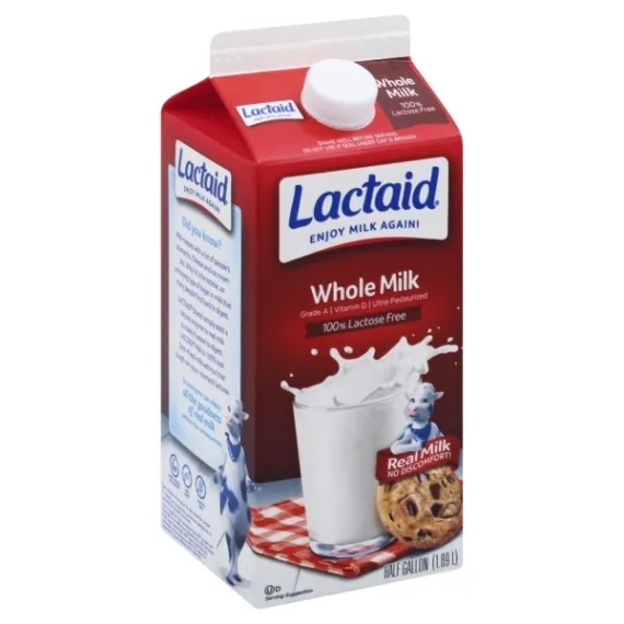 Details Ingredients MILK, LACTASE ENZYME* AND VITAMIN D3. Product features Milk, Whole, Carton 0.5 GL 100% lactose free. 100% real milk. No discomfort. Easy to digest. Grade A. Vitamin D. Ultra-pasteurized. No discomfort. New flavors! For more information about our family of Lactaid products and delicious recipe ideas, visit lactaid.com. Delicious and nutritious! Did you know - that Lactaid Milk is 100% real, farm-fresh milk with all of the vitamins and calcium found in milk, but none of the lactose? That's what makes Lactaid Milk so great. You can fully enjoy it without stomach discomfort, while benefitting from all the healthy goodness inside. Lactaid Milk. The original 100% lactose free milk. Lactaid Farmers' Pledge: From cows not treated with artificial growth hormone. No significant difference has been shown between milk derived from rBST-treated and non-rBST-treated cows. If you have any questions or comments in English or Spanish, call us toll free at 1-800-Lactaid or visit us at lactaid.com. Delicious, easy to digest milk with all of the nutrients. No matter what type of Lactaid Milk you buy, you are getting 100% farm-fresh. delicious milk with all the nutrients and none of the lactose. Ultra-pasteurized and homogenized at plant stamped on top. Gluten free. May be sold until midnight of date indicated on top. This milk is ultra-pasteurized to last longer unopened. Once opened, consume within seven days. Keep refrigerated. Do not use if seal under cap is broken. 0.5 gl (1.89 lt) Lynnfield, MA 01940 800-LACTAID McNeil Nutritionals, LLC 2015 Milk, Whole Enjoy milk again! Grade A. Vitamin D. Ultra-pasteurized. 100% lactose free. Good source of protein (see nutrition information for saturated fat content). rBST free (To satisfy our consumers, our farmers pledge not to use artificial growth hormones). Gluten free. Real milk no discomfort! Enjoy ice cream again! Lactaid Ice Cream is delicious, rich and creamy, because it's made with only the finest ingredients. And best of all it's made with lactose free milk and cream, so it is naturally easy to digest. Look for all 6 flavors of Lactaid Ice Cream in your grocer's freezer. Real Ice Cream no discomfort! For more of your dairy favorites, check out nutritious cottage cheese! Did you know? Milk messes with a lot of people's stomachs. Cheese and ice cream too. Why? It's the lactose, an annoying type of sugar in milk that many people find hard to digest. Lactaid Brand simply adds a natural enzyme to real milk to make it easier to digest. Lactaid Milk is 100% real farm-fresh milk without that tough-on-your-stomach lactose. So everyone can enjoy all the goodness of real milk without the consequences. Even though the FDA concluded that rBST is safe and that there is no difference between the milk obtained from cows treated with rBST and those that are untreated, we are happy to offer this option in response to your feedback and requests. Delicious, easy to digest milk. No matter what type of Lactaid Milk you buy, you are getting 100% farm-fresh, delicious milk with all the nutrients of milk and none of the lactose. Ultra-pasteurized and homogenized at plant stamped on top. May be sold until midnight of date indicated on top. If you have any questions or comments in English or Spanish, call us toll free at 1-800-Lactaid or visit us at lactaid.com. Special Features Ultra-pasteurized Net Quantity of Content 8 X 1 cup
