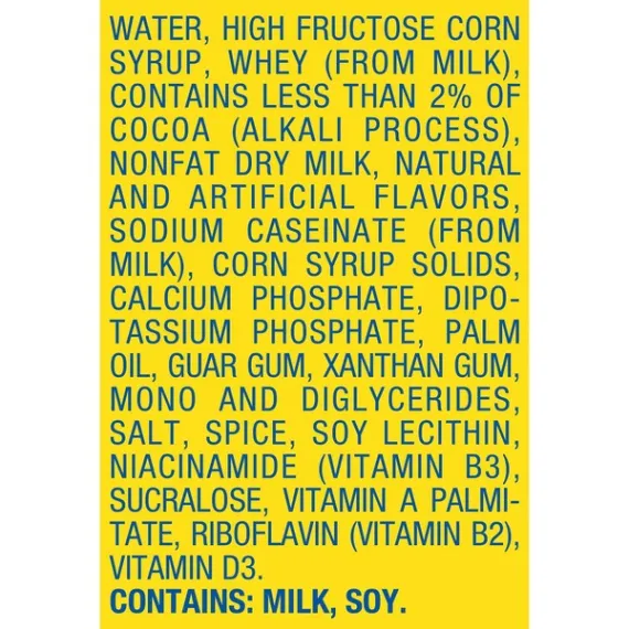 Details Ingredients WATER, HIGH FRUCTOSE CORN SYRUP, WHEY (FROM MILK) AND CONTAINS 2% OR LESS OF: COCOA (ALKALI PROCESS), NONFAT DRY MILK, NATURAL AND ARTIFICIAL FLAVORS, SODIUM CASEINATE (FROM MILK), CORN SYRUP SOLIDS, CALCIUM PHOSPHATE, DIPOTASSIUM PHOSPHATE, PALM OIL, GUAR GUM, XANTHAN GUM, MONO AND DIGLYCERIDES, SALT, SPICE, SOY LECITHIN, NIACINAMIDE (VITAMIN B3), SUCRALOSE, VITAMIN A PALMITATE, RIBOFLAVIN (VITAMIN B2), VITAMIN D3 Show more Product features For eight generations, Yoo-hoo has been a sweet tooth satisfier with its refreshing chocolate flavor. The perfect beverage for the chocolate lover, the smooth and rich taste of Yoo-hoo chocolate drink is sure to hit the spot. Great to pack in a lunchbox or to enjoy alongside your favorite snack, these 6.5 fl oz boxes are a sweet treat that kids are sure to love. They are 99% fat free and caffeine free, and they’re rich in calcium and Vitamin D. Shake up some delicious fun with the classic taste of Yoo-hoo. Original Chocolate flavorRich in calcium and vitamin DCaffeine free Net Quantity of Content 32 X 6.5 fl oz