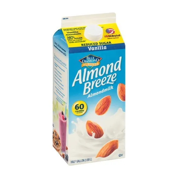Details Ingredients Almondmilk (Filtered Water, Almonds), Cane Sugar, Calcium Carbonate, Natural Flavors, Sea Salt, Potassium Citrate, Sunflower Lecithin, Gellan Gum, Vitamin A Palmitate, Vitamin D2, D-Alpha-Tocopherol (Natural Vitamin E). Contains: Almonds Show more Product features Almond Breeze® is a delicious way to be good to yourself! Made with real California almonds, Almond Breeze® is a tasty, creamy alternative to dairy or soymilk. It's free of lactose, cholesterol, peanuts, casein, gluten, eggs, saturated fat and MSG. Almond Breeze® – The Best Almonds Make The Best Almondmilk Blue Diamond Almond Breeze Reduced Sugar Vanilla Almondmilk: Soy free Lactose free 60 calories per serving 50% more calcium than milk Made from real almonds An excellent source of vitamins D and E Gluten free Blue Diamond Almond Breeze Reduced Sugar Vanilla Almondmilk is delicious-tasting almondmilk from the almond people. Blue Diamond Almond Breeze Reduced Sugar Vanilla Almondmilk has just a hint of sweetness and 38% less sugar than regular original almondmilk. It is perfect by itself in a glass, in a smoothie, over cereal, or for cooking and baking. Net Quantity of Content 8 X 1 cup