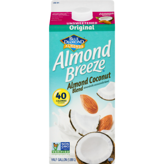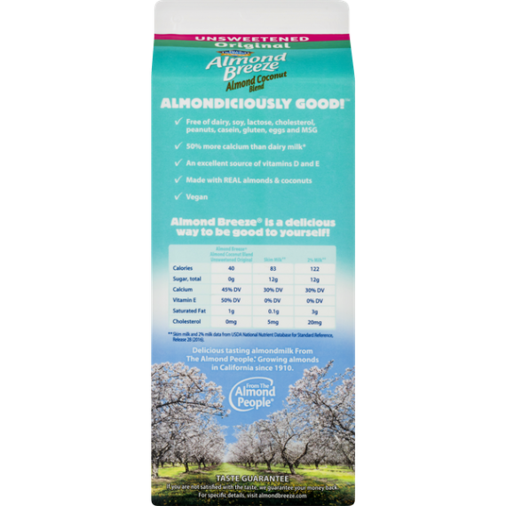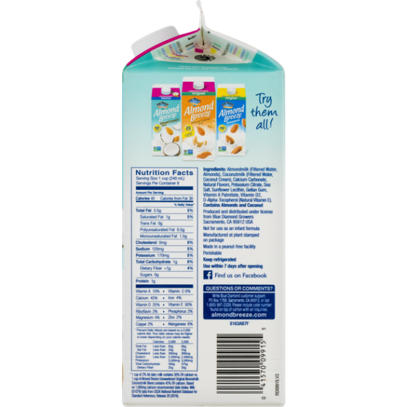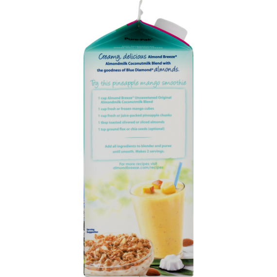 Details Ingredients ALMONDMILK (FILTERED WATER, ALMONDS), COCONUTMILK (FILTERED WATER, COCONUT CREAM), CALCIUM CARBONATE, NATURAL FLAVORS, POTASSIUM CITRATE, SEA SALT, SUNFLOWER LECITHIN, GELLAN GUM, VITAMIN A PALMITATE, VITAMIN D2, D-ALPHA-TOCOPHEROL (NATURAL VITAMIN E). Show more Product features Blue Diamond® Almond Breeze® Almond Coconut Blend Unsweetened Original. Made with real almonds & coconuts. Unsweetened product has 50% more calcium than dairy milk. It is an excellent source of vitamin D and E. This vegan product is free of dairy, soy, lactose, cholesterol, peanuts, casein, gluten, eggs, GMOs and MSG. Blue Diamond Almond Breeze Unsweetened Almondmilk Coconutmilk Blend: Made from real almonds and coconut All natural Soy free; lactose free 50% more calcium than milk 45 calories per serving Contains no cholesterol Contains no added sweeteners; kosher; vegan Made in a peanut-free facility, Blue Diamond Almond Breeze Unsweetened Almondmilk Coconutmilk Blend is made from almonds that were not genetically engineered. Blue Diamond almond growers are known for growing some of the world's finest almonds from the orchards of California. No one knows tree nuts better than Blue Diamond. Their almonds are carefully blended with coconut to produce a rich, creamy non-dairy milk. It is free of dairy, soy, lactose, cholesterol, peanuts, casein, gluten, eggs, and MSG. This Almondmilk Coconutmilk Blend is all natural with added vitamins and minerals. It contains medium chain fatty acids (MCFA's) and is an excellent source of calcium, vitamins D and E. Net Quantity of Content 8 X 1 cup