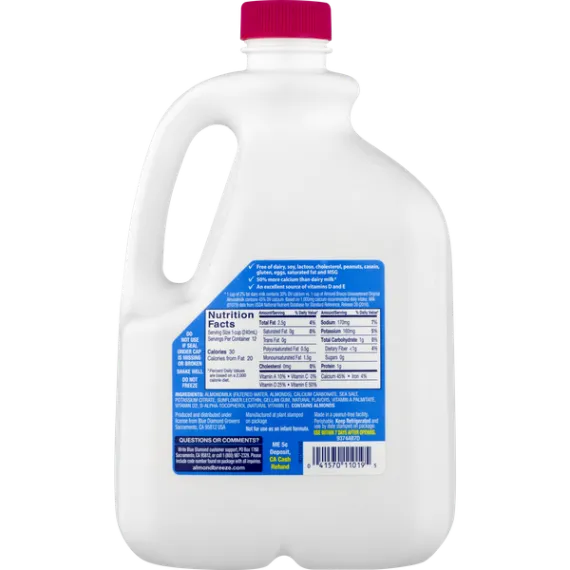 Details Ingredients Almondmilk (Filtered Water, Almonds), Calcium Carbonate, Sea Salt, Potassium Citrate, Sunflower Lecithin, Gellan Gum, Natural Flavors, Vitamin A Palmitate, Vitamin D2, D-Alpha-Tocopherol (Natural Vitamin E). Contains: Almonds Show more Product features Almond Breeze® is a delicious way to be good to yourself! Made with real California almonds, Almond Breeze® is a tasty, creamy alternative to dairy or soymilk. It's free of lactose, cholesterol, peanuts, casein, gluten, eggs, saturated fat and MSG. Almond Breeze® – The Best Almonds Make The Best Almondmilk Blue Diamond Almonds Almond Breeze Unsweetened Original Almondmilk, 96 fl oz Net Quantity of Content 12 X 1 cup