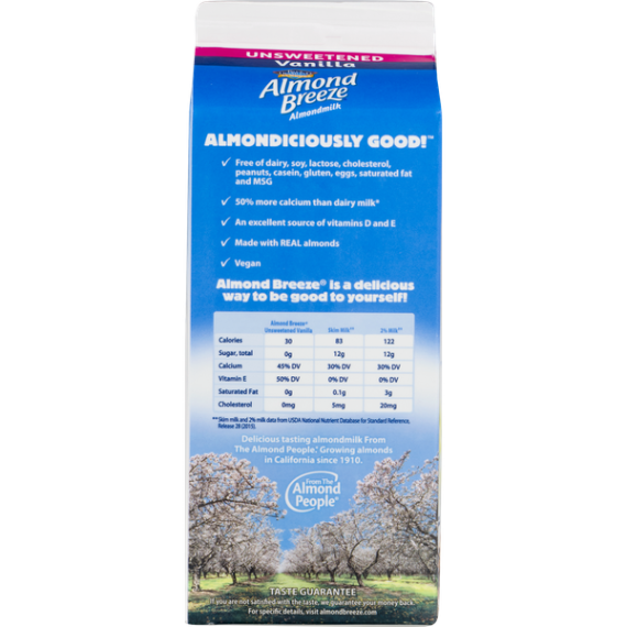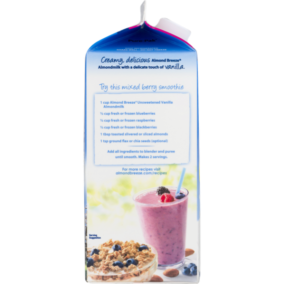 Details Ingredients Almondmilk (Filtered Water, Almonds), Calcium Carbonate, Natural Flavors, Sea Salt, Potassium Citrate, Sunflower Lecithin, Gellan Gum, Vitamin A Palmitate, Vitamin D2, D-Alpha-Tocopherol (Natural Vitamin E). Show more Product features This Blue Diamond Almond Breeze Unsweetened Vanilla Almond Milk is a wonderful choice for people who are interested in a non-dairy milk alternative. This drink is all natural and made with added vitamins and minerals. It provides an excellent source of vitamins D and E and is made from real almonds. This Blue Diamond unsweetened vanilla almond milk features the taste of vanilla and contains no added sweeteners. Enjoy this milk in your morning cereal or oatmeal, add it to your coffee or tea, use it as an ingredient in your favorite smoothie or drink it alone out of a glass. This delicious, non-dairy beverage is rich and creamy and offers a pleasant aftertaste that will keep you coming back for more. This package includes one 0.5-gal carton of all-natural milk made from almonds in a vanilla flavor. A plain version is also available and sold separately. Blue Diamond Almond Breeze Unsweetened Vanilla Almond Milk, 0.5 gal: All natural with added vitamins and minerals An excellent source of vitamins D and E Made from real almonds Contains no added sweeteners Delicious, non-dairy beverage Rich and creamy with a pleasant aftertaste Delicious Blue Diamond unsweetened vanilla almond milk 0.5-gal carton of almond milk Plain version also available (sold separately) Hint of vanilla Enjoy with cereal, oatmeal, smoothies and more Special Features 40 calories per serving Net Quantity of Content 8 X 8oz