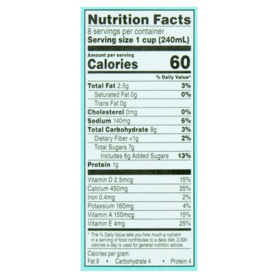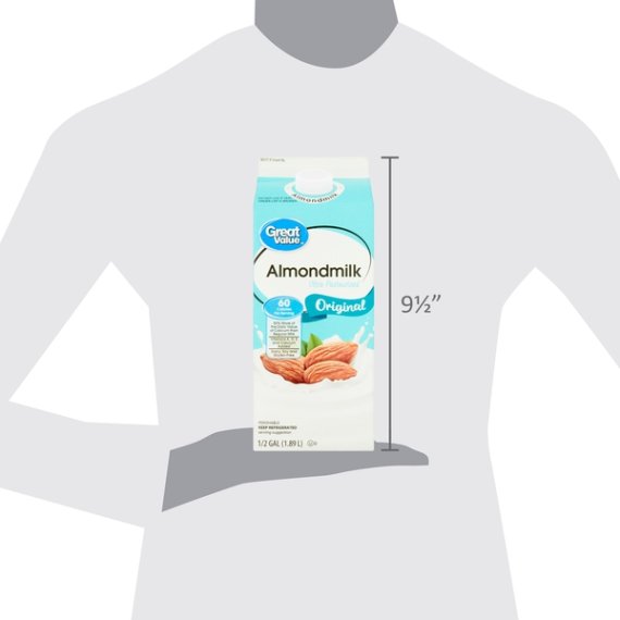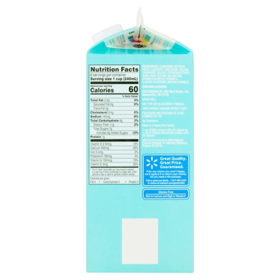 Details Ingredients ALMONDMILK (FILTERED WATER, ALMONDS), CANE SUGAR, CALCIUM CARBONATE, SEA SALT, POTASSIUM CITRATE, SUNFLOWER LECITHIN, GELLAN GUM, VITAMIN A PALMITATE, VITAMIN D2, D-ALPHA-TOCOPHEROL (NATURAL VITAMIN E). Show more Product features 1 cup of milk contains 20% DV calcium vs. 1 cup of Original Almondmilk contains 35% DV calcium Great Value Original Almondmilk is a delicious alternative to dairy milk for a plant-based lifestyle. Our original almondmilk is made from premium quality ingredients. The delicate, nutty flavor comes with a mixture of healthy nutrients such as calcium and vitamins A, D, and E. This delicious beverage goes great on your favorite cereals, blended into a healthy fruit smoothie, or in a cup of hot or iced coffee. You can also mix this dairy-free milk into your favorite baked goods or savory soups. Say yes to the simple plant-powered goodness of Great Value Original Almondmilk. Great Value products provide families with affordable, high quality grocery and household consumable options. With our wide range of product categories spanning grocery and household consumables, we offer you a variety of products for your family's needs. Our products are conveniently available online and in Walmart stores nationwide, allowing you to stock up and save money at the same time. Ultra-pasteurized with vitamin A, D, E, and calcium added 60 calories per serving 50% more of the daily value of calcium than regular milk Dairy, soy, and gluten-free No cholesterol Net Quantity of Content 8 X 1 cup