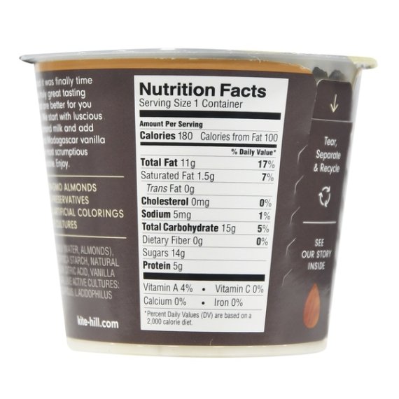 Details Ingredients ALMOND MILK (WATER, ALMONDS), CANE SUGAR, ORGANIC TAPIOCA STARCH, NATURAL FLAVOR, LOCUST BEAN GUM, CITRIC ACID, VANILLA BEAN, XANTHAN GUM, AGAR, LIVE ACTIVE CULTURES: S.THERMOPHILUS, L.BULGARICUS, L.ACIDOPHILUS AND BIFIDOBACTERIA. Show more Product features Yogurt, Vanilla, Almond Milk, Cup 5.3 OZ Traditionally cultured. Soy & dairy free. Stir & enjoy! Tear, separate & recycle. See our story inside. At Kite Hill, we decided it was finally time for someone to make truly great tasting plant-based foods that are better for you and the environment. We start with luscious and creamy whole almond milk and add live active cultures and Madagascar vanilla beans to produce the most scrumptious non-dairy yogurt available. Enjoy. Dairy free. Soy free. Gluten free. Vegan. Non-GMO almonds. No preservatives. No artificial colorings. Live cultures. kite-hill.com. Best by: See lid. Perishable. Keep refrigerated. Contains almonds. 5.3 oz (150 g) Hayward, CA 94545 2015 Lyrical Foods, Inc. Yogurt, Artisan Almond Milk, Vanilla Traditionally cultured. Dairy free. Soy free. Gluten free. Vegan. No artificial flavor or preservatives. Non GMO Project verified. nongmoproject.org. Stir & enjoy! See our story inside. At Kite Hill, we decided it was finally time for someone to make truly great tasting plant-based foods that are good for you and the environment. We start with luscious and creamy whole almond milk and add live active cultures and vanilla beans to produce the most scrumptious non-dairy yogurt available. Enjoy! kite-hill.com. Tear, separate & recycle. Net Quantity of Content 1 X 5.3 oz