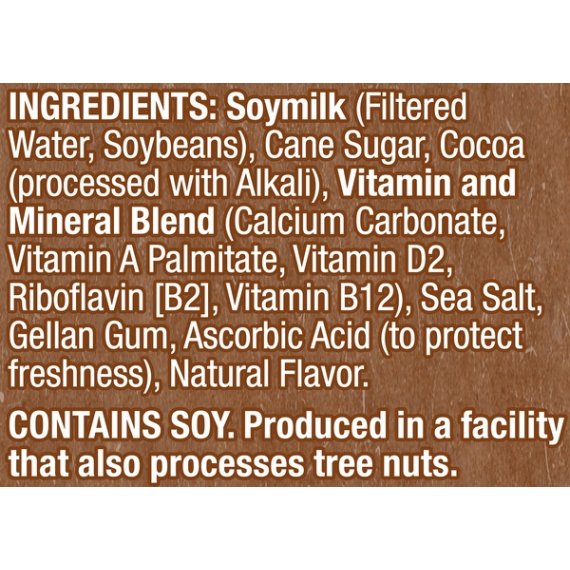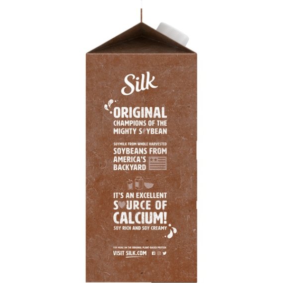 Details Ingredients Soymilk (Filtered Water, Soybeans), Cane Sugar, Cocoa (Processed with Alkali), Vitamin and Mineral Blend (Calcium Carbonate, Vitamin A Palmitate, Vitamin D2, Riboflavin [B2], Vitamin B12), Sea Salt, Gellan Gum, Ascorbic Acid (To Protect Freshness), Natural Flavor. Show more Product features Three cheers for the power of the plant. Count on Silk Soy Chocolate Non-Dairy Soymilk 64oz. for deliciously nourishing, 100% plant-based protein. It's the powerful nutrition you want, without the stuff you don't. Six grams of heart-healthy plant-based protein in every glass. Low in saturated fat. Absolutely no cholesterol, dairy, lactose or artificial colors & flavors. Smooth and delicious Heart healthy Kosher dairy Lactose-free Green caps for greener earth Nobody makes soymilk like we do. We like to think of soy as nature's perfect protein--nature's perfect protein 100% whole harvested--and you just don't mess with perfection. Special Features Heart healthy Net Quantity of Content 8 X 1 cup