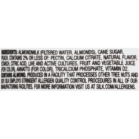 Details Ingredients Almondmilk (Filtered Water, Almonds), Cane Sugar, Peach, contains 2% or less of: Pectin, Calcium Citrate, Natural Flavor, Starch, Citric Acid, Live and Active Cultures, Fruit and Vegetable Juice (For Color), Annatto (For Color), Tricalcium Phosphate, Vitamin D2. Contains: Almond. Show more Product features Spoon up dairy-free deliciousness! Silk® Peach Almondmilk Yogurt Alternative starts with one of our favorite ingredients: irresistible almonds. Blended with juicy peaches, each spoonful is smooth, creamy, and totally soy-free. 5g of protein from California Almonds Live & Active Cultures Non-GMO Project Verified Silk Almondmilk Dairy-Free Peach Yogurt Alternative, 5.3 oz Net Quantity of Content 1 X 150 g