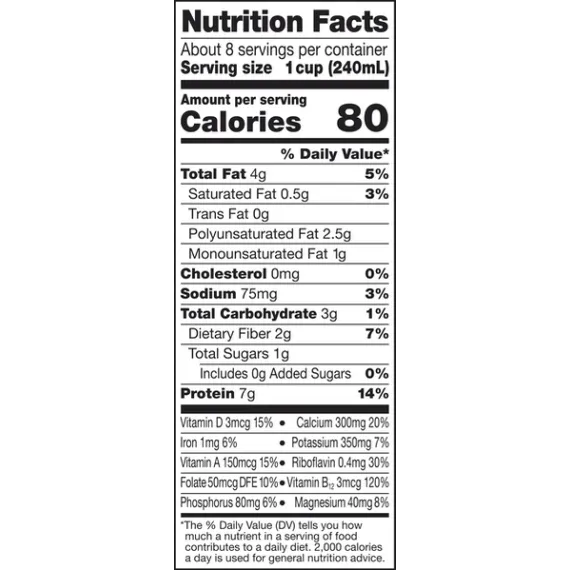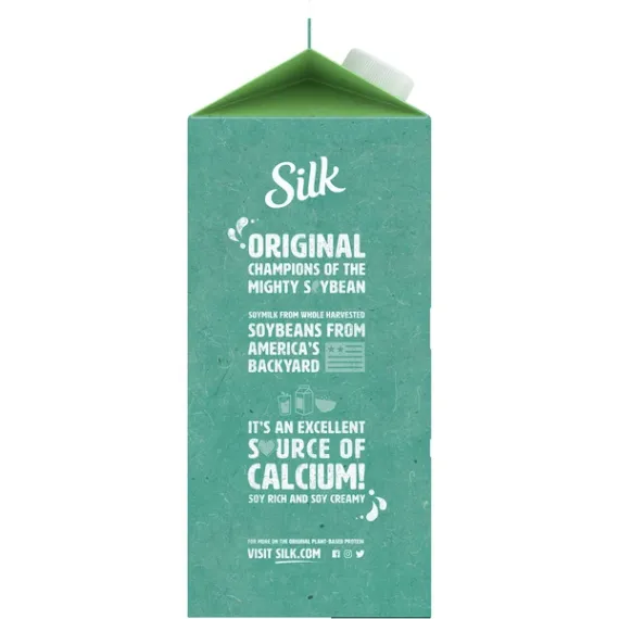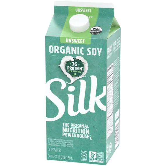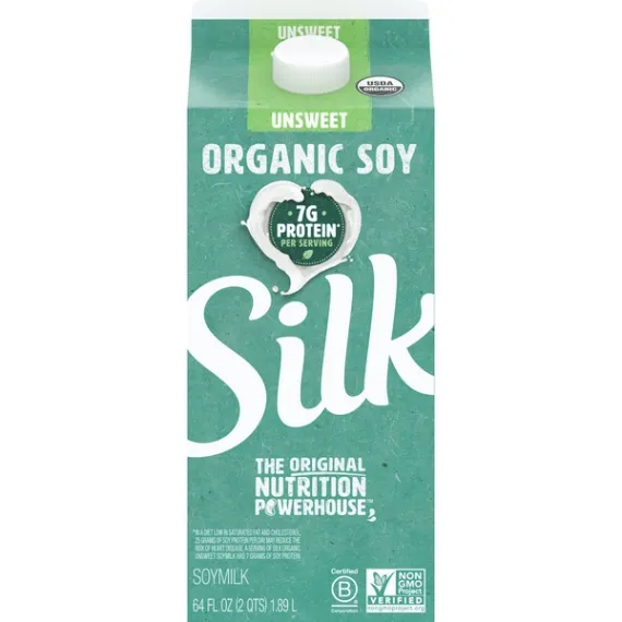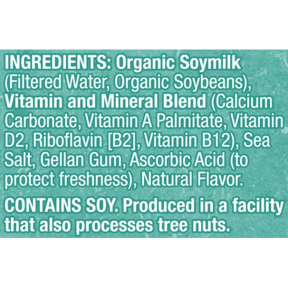 Details Ingredients Organic Soymilk (Filtered Water, Organic Soybeans), Vitamin and Mineral Blend (Calcium Carbonate, Vitamin A Palmitate, Vitamin D2, Riboflavin [B2], Vitamin B12), Sea Salt, Gellan Gum, Ascorbic Acid (to protect freshness), Natural Flavor. Show more Product features Three cheers for the power of the plant. Count on Silk Soy Unsweetened Organic Unsweetened Non-Dairy Soymilk 64oz. for deliciously nourishing, 100% plant-based protein. It's the powerful nutrition you want, without the stuff you don't. Seven grams of heart-healthy plant-based protein in every glass. Low in saturated fat. Absolutely no cholesterol, dairy, lactose or artificial colors and flavors. 7 grams soy protein Heart healthy Kosher dairy Unsweetened Organic Made with organic soybeans Special Features Green energy Net Quantity of Content 8 X 1 cup