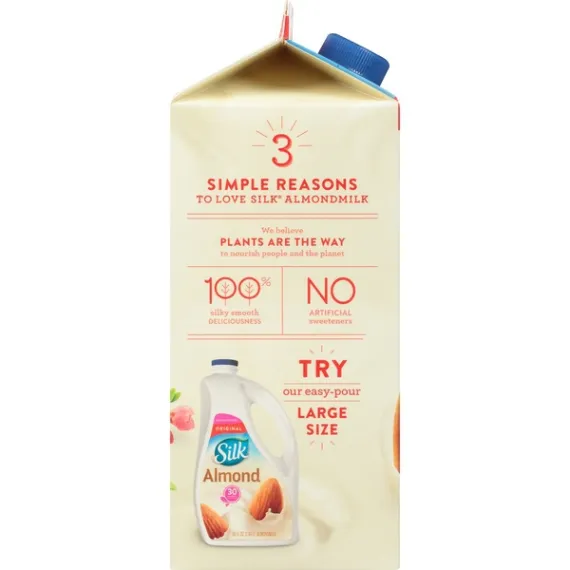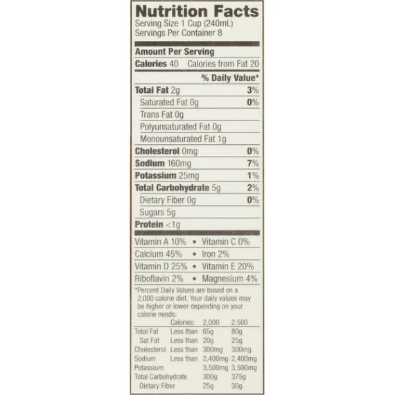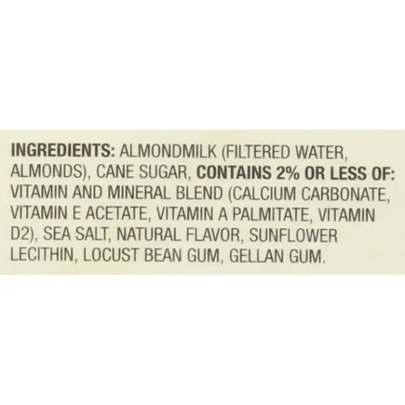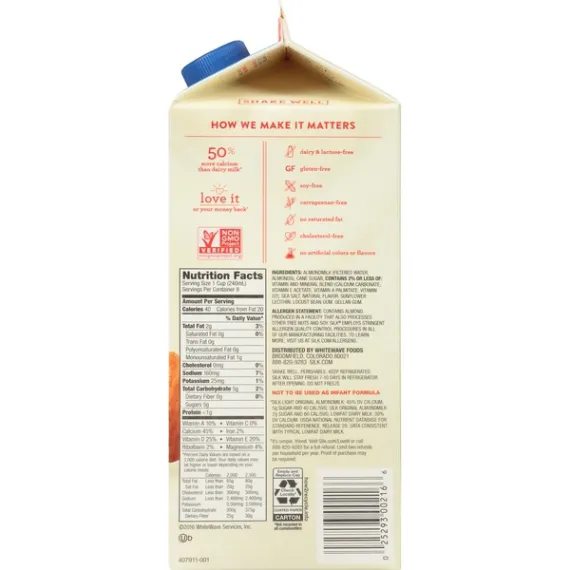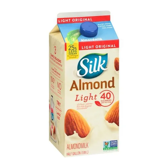 Details Ingredients Almondmilk (Filtered Water, Almonds), Cane Sugar, contains 2% or less of: Vitamin and Mineral Blend (Calcium Carbonate, Vitamin E Acetate, Vitamin A Palmitate, Vitamin D2), Sea Salt, Natural Flavor, Sunflower Lecithin, Locust Bean Gum, Gellan Gum. Contains: Almond. Show more Product features At 40 calories per serving, Silk Light Original Almondmilk is happiness in a glass. You heard right - that's 1/3 fewer calories than our regular almondmilk* and still 50% more calcium than dairy milk.** Free of dairy, soy, lactose, gluten, casein, egg and MSG. Our passion is plant-powered. It's delicious over cereal, mixed with coffee, added to favorite recipes or chugged straight from the carton. Silk Original Light Almondmilk, 0.5 gallon: 40 calories per 8 fl.oz. serving 50% more calcium than dairy milk** Dairy Free Soy Free Lactose Free Gluten Free Casein Free Non-GMO Project Verified No artificial colors or flavors *Silk Original Almondmilk, 60 cal/svg. Silk Light Original Almondmilk, 40 cal/svg. **Silk Light Original Almondmilk: 45% DV of calcium vs. 30% DV in 1% dairy milk. USDA National Nutrient Database for Standard Reference, Release 28. Data consistent with typical 1% dairy milk. Net Quantity of Content 8 X 1 cup