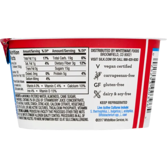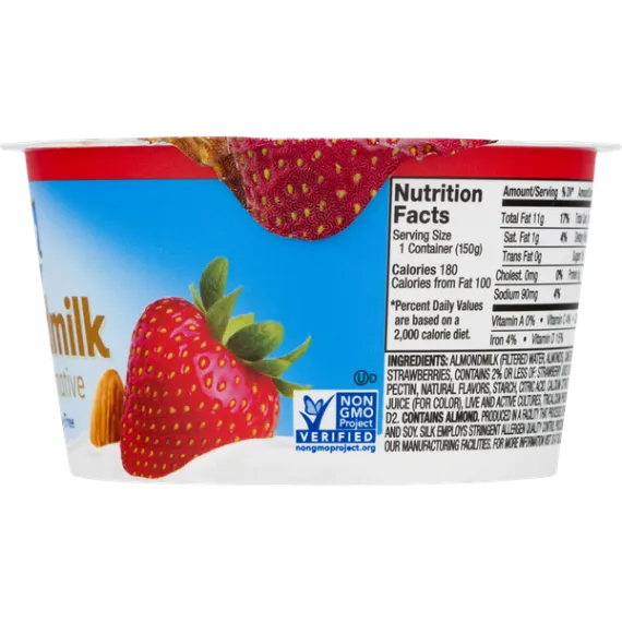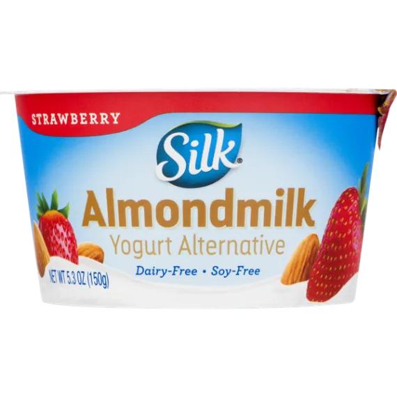 Details Ingredients Almondmilk (Filtered Water, Almonds), Cane Sugar, Strawberries, contains 2% or less of: Strawberry Juice Concentrate, Pectin, Natural Flavors, Starch, Citric Acid, Calcium Citrate, Vegetable Juice (For Color), Live and Active Cultures, Tricalcium Phosphate, Vitamin D2. Contains: Almond. Show more Product features Spoon up dairy-free deliciousness! Silk Strawberry Almondmilk Yogurt Alternative starts with one of our favorite ingredients: irresistible almonds. Blended with sweet strawberries; each spoonful is smooth, creamy, and totally soy-free. Made with the quality ingredients. Free from carrageenan, dairy, soy and gluten. Silk Strawberry Almondmilk Yogurt Alternative 5.3 oz: Dairy free 5g of protein from California Almonds Live & Active Cultures Non GMO Project Verified Excellent source of Calcium and Vitamin D Free from cholesterol, dairy, soy, lactose, gluten, carrageenan and casein. No artifical colors, flavors, or funny stuff. Net Quantity of Content 1 X 150 g