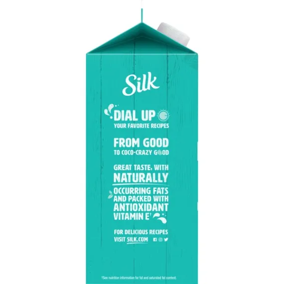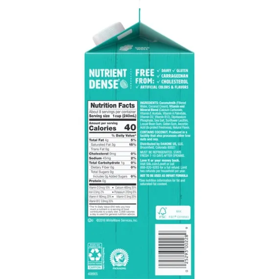 Details Ingredients Coconutmilk (Filtered Water, Coconut Cream), contains 2% or less of: Vitamin and Mineral Blend (Calcium Carbonate, Vitamin A Palmitate, Vitamin B12, Vitamin D2), Sea Salt, Natural Flavor, Sunflower Lecithin, Locust Bean Gum, Gellan Gum. Contains: Coconut. Show more Product features Grab a taste of the tropics with Silk Unsweetened Coconutmilk. Each yummy serving is 45 calories, with no added sugar.* And just like our regular coconutmilk, it brings wonderfully rich flavor with 50% more calcium than dairy milk.** It's perfect for smoothies, recipes or your morning coffee. Silk Unsweetened Coconut Milk, 0.5 gal:50% more calcium than dairy milk**No added sugar*Dairy FreeSoy FreeLactose FreeGluten FreeCasein FreeNon-GMO Project's VerifiedNo artificial colors or flavors *Not a reduced calorie food. See Nutrition Facts for information on sugar and calorie content **Silk Unsweetened Coconutmilk: 45% DV of calcium vs. 30% DV in 2% dairy milk. USDA National Nutrient Database for Standard Reference, Release 26> Data consistent with typical 2% dairy milk. Product contains 4.5 grams of saturated fat. Net Quantity of Content 8 X 1 cup