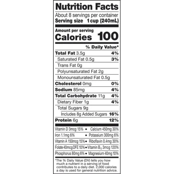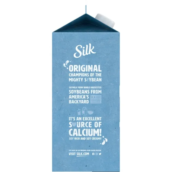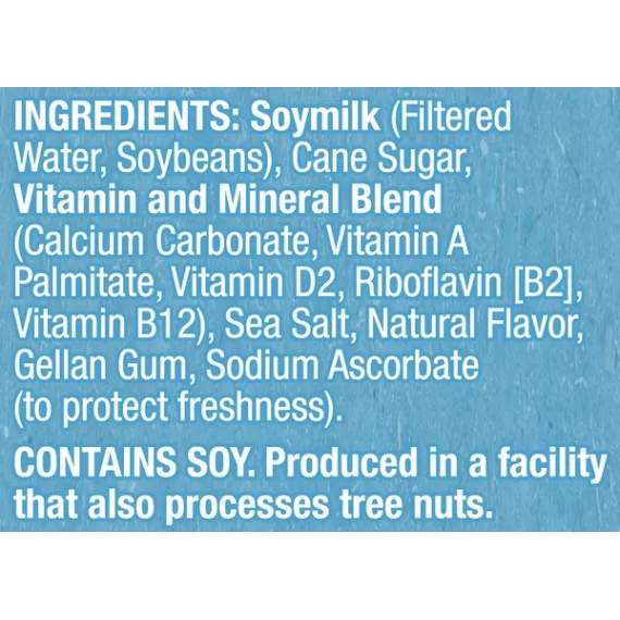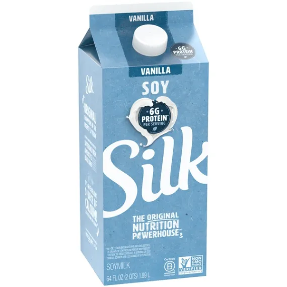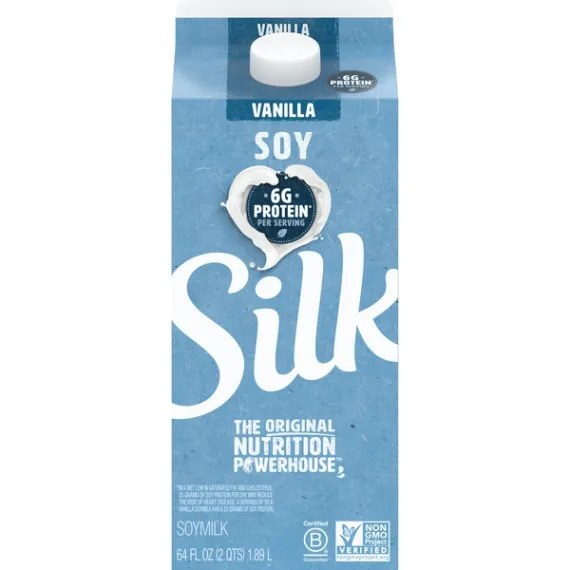 Details Ingredients Soymilk (Filtered Water, Soybeans), Cane Sugar, Vitamin and Mineral Blend (Calcium Carbonate, Vitamin A Palmitate, Vitamin D2, Riboflavin [B2], Vitamin B12), Sea Salt, Natural Flavor, Gellan Gum, Sodium Ascorbate (To Protect Freshness). Show more Product features Three cheers for the power of the plant. Count on Silk Soy Vanilla Non-Dairy Soymilk 64 oz. for deliciously nourishing, 100% plant-based protein. It's the powerful nutrition you want, without the stuff you don't. Six grams of heart-healthy plant-based protein in every glass. Low in saturated fat. Absolutely no cholesterol, dairy, lactose or artificial colors and flavors. Try it anywhere you enjoy dairy milk?over your cereal, in your coffee or simply by itself. We're talking irresistible vanilla flavor and 50% more calcium than dairy milk.1 Plus, our soymilk is a good source of soy protein. There is nothing fancy about our soymilk. It's just made with plenty of care and attention. Go ahead, and call us old-fashioned. 6 grams soy protein Heart healthy Kosher dairy Our best taste ever Smooth and delicious Green caps for a greener world Excellent calcium source Nobody makes soymilk like we do. We like to think of soy as nature's perfect protein--nature's perfect protein 100% whole harvested--and you just don't mess with perfection. Special Features Smooth and delicious Net Quantity of Content 8 X 1 cup
