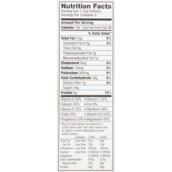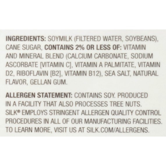 Details Ingredients Soymilk (Filtered Water, Soybeans), Cane Sugar, contains 2% or less of: Vitamin and Mineral Blend (Calcium Carbonate, Sodium Ascorbate [Vitamin C], Vitamin A Palmitate, Vitamin D2, Riboflavin [B2], Vitamin B12), Sea Salt, Natural Flavor, Gellan Gum. Show more Product features Three cheers for the power of Silk Very Vanilla Soymilk for deliciously nourishing, 100% plant-based protein. It's the powerful nutrition you want, without the stuff you don't. Six grams of heart-healthy plant-based protein in every glass. Low in saturated fat. Absolutely no cholesterol, dairy, lactose or artificial colors & flavors. Silk Very Vanilla Soymilk, Half Gallon 6 grams soy protein Heart healthy Kosher dairy Fortified for kids Smooth and delicious Green caps for a greener world 100% lactose and dairy free Nobody makes soymilk like we do. We like to think of soy as nature's perfect protein--nature's perfect protein 100% whole harvested--and you just don't mess with perfection. Special Features Cholesterol free Net Quantity of Content 8 X 1 cup