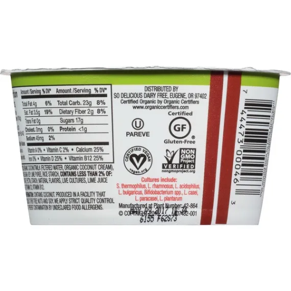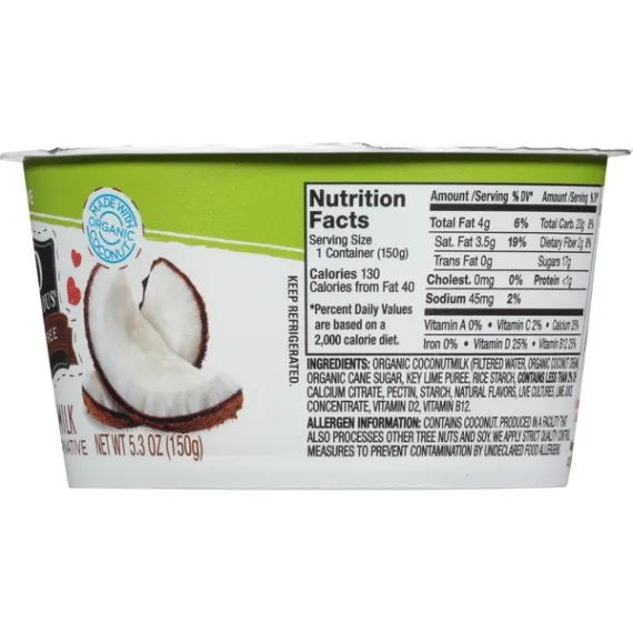Details Ingredients Organic Coconutmilk (Filtered Water, Organic Coconut Cream, Organic Cane Sugar, Key Lime Puree, Rice Starch, contains less than 2% of: Calcium Citrate, Pectin, Starch, Natural Flavors, Live Cultures, Lime Juice Concentrate, Vitamin D2, Vitamin B12. Contains: Cocount. Show more Product features So Delicious Dairy Free Key Lime Yogurt Alternative delivers live & active cultures and amazing, dairy-free flavor. Just the right balance of creamy coconut and bright key lime in every bite! Made with organic coconut and Non-GMO Project Verified. We make compassionate food for passionate people. At So Delicious Dairy Free, we believe life is sweeter when it's dairy-free. We continually strive to make delicious dairy-free delights, because we believe everyone should enjoy ice cream, a bowl of cereal, and a perfectly prepped cup of coffee. We also believe that everyone has the right to know what's in their food, and quality ingredients are always worth the effort. That's why our products are proudly dairy-free, certified vegan and never contain any artificial flavors or sweeterners. Enjoy any of our dairy-free frozen desserts, beverages, creamers and yogurt alternatives, and say yes to what you love! So Delicious Dairy Free Coconut Milk Key Lime Yogurt Alternative, 5.3 oz.: Made with organic coconut Non GMO Project Verified Certified Gluten Free Certified Vegan Carrageenan Free Kosher Parve Net Quantity of Content 1 X 150 g