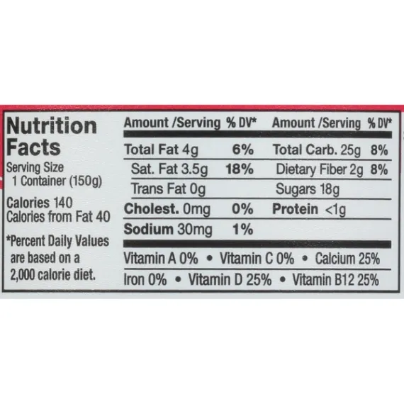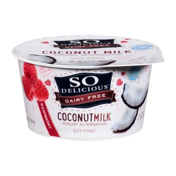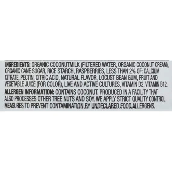Details Ingredients Organic Coconutmilk (Filtered Water, Organic Coconut Cream), Organic Cane Sugar, Rice Starch, Raspberries, less than 2% of: Calcium Citrate, Pectin, Citric Acid, Natural Flavor, Locust Bean Gum, Fruit and Vegetable Juice (For Color), Live and Active Cultures, Vitamin D2, Vitamin B12. Contains: Coconut. Show more Product features So Delicious Dairy-Free Coconut Milk Raspberry Yogurt Alternative 5.3oz.delivers dairy-free probiotic culture with amazing flavor with just the right balance of tanginess and sweetness. We even have two flavors with less than 1g of sugar per serving. Each of our 10 flavors are made with simple ingredients that are Non-GMO Project Verified, Certified Gluten-Free, and Certified Vegan. We make compassionate food for passionate people. At So Delicious Dairy Free, we believe life is sweeter when it's dairy-free. We continually strive to make delicious dairy-free delights, because we believe everyone should enjoy ice cream, a bowl of cereal, and a perfectly prepped cup of coffee. We also believe that everyone has the right to know what's in their food, and quality ingredients are always worth the effort. That's why our products are proudly dairy-free, certified vegan and never contain any artificial flavors or sweeteners. Enjoy any of our dairy-free frozen desserts, beverages, creamers and yogurt alternatives, and say yes to what you love! So Delicious Dairy Free Raspberry Coconut Milk Yogurt Alternative, 5.3 oz.: Dairy Free Made with organic coconut Non GMO project verified Certified Gluten Free Net Quantity of Content 1 X 150 g