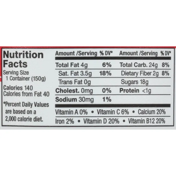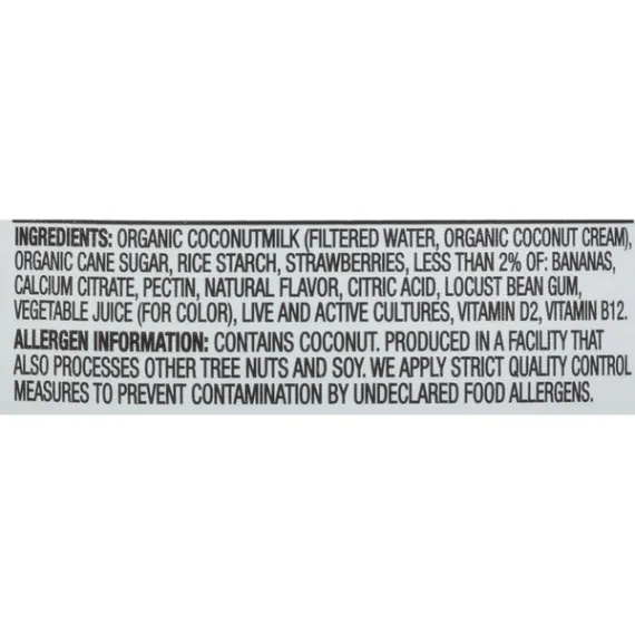 Details Ingredients Organic Coconutmilk (Filtered Water, Organic Coconut Cream), Organic Cane Sugar, Rice Starch, Strawberries, less than 2% of: Bananas, Calcium Citrate, Pectin, Natural Flavor, Citric Acid, Locust Bean Gum, Vegetable Juice (For Color), Live and Active Cultures, Vitamin D2, Vitamin B12. Contains: Coconut. Show more Product features Thick and creamy So Delicious Dairy Free Coconut Milk Strawberry Banana "Yogurt" Alternative 5.3oz. exploding with sweet strawberry and banana flavors.Our coconutmilk yogurt alternatives deliver dairy-free probiotic culture with amazing flavor with just the right balance of tanginess and sweetness. Each of our 10 flavors are made with simple ingredients that are Non-GMO Project Verified, Certified Gluten-Free, and Certified Vegan. So Delicious Dairy Free has been making dairy-free delights for over 30 years! We offer a variety of delicious foods and beverages that you can feel great about sipping, biting, pouring, scooping, licking, and chugging throughout your day. We?re committed to doing the right things for people and the planet, from maintaining a robust allergen-testing program to creating innovative products made with only the highest quality ingredients So Delicious Dairy-Free Strawberry Banana Coconut Milk Yogurt Alternative, 5.3 oz.: Dairy Free Made with organic coconut Non GMO Project Verified Net Quantity of Content 1 X 150 g