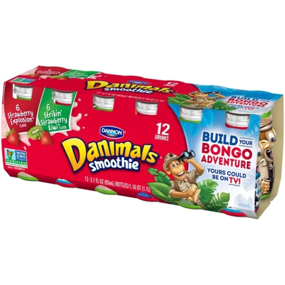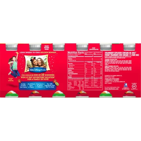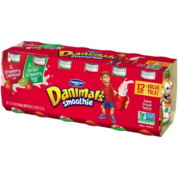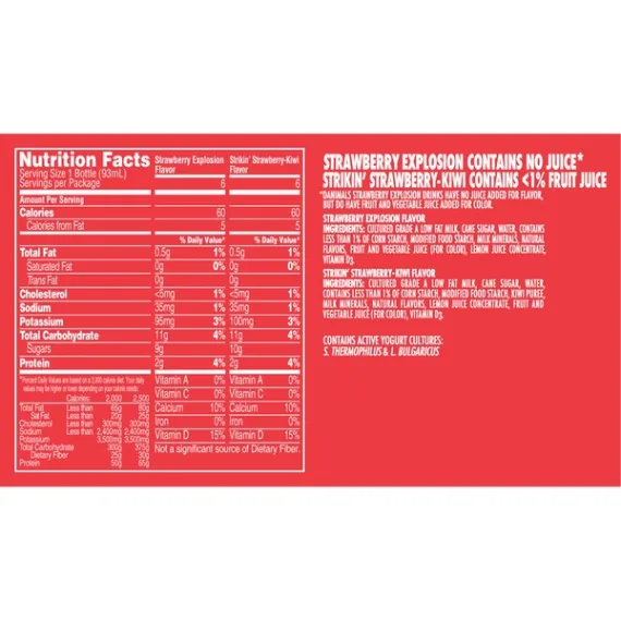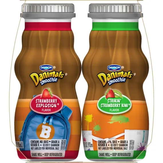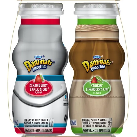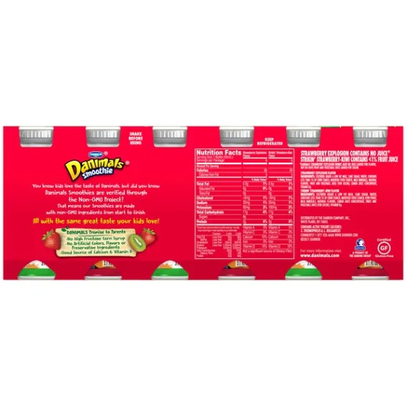 Details Ingredients Strawberry Explosion Flavor Cultured Grade A Low Fat Milk, Cane Sugar, Water, contains less than 1% of Corn Starch, Modified Food Starch, Milk Minerals, Natural Flavors, Fruit and Vegetable Juice (For Color), Lemon Juice Concentrate, Vitamin D3. Show more Product features This yogurt smoothie is bursting with strawberry and cotton candy flavor! With no high fructose corn syrup, artificial colors and flavors, youll be happy giving your little monkey this delicious snack. As always, a good source of Calcium and Vitamin D. Danimals Lowfat Yogurt Smoothies Strawberry Explosion & Strikin' Strawberry Kiwi, 3.1fl Oz., count of 12: Value Pack No artificial Colors or Flavors No High Fructose Corn Syrup No artificial colors or flavors Good source of Calcium & Vitamin D Special Features Plus natural lactobacillus gg (lgg) probiotic. Net Quantity of Content 6 X 93.00 ml