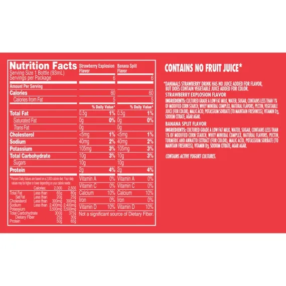 Details Ingredients Strawberry Explosion Flavor Cultured Grade A Low Fat Milk, Cane Sugar, Water, contains less than 1% of Corn Starch, Modified Food Starch, Milk Minerals, Natural Flavors, Fruit and Vegetable Juice (For Color), Lemon Juice Concentrate, Vitamin D3. Show more Product features Smoothie, Strawberry Explosion, Banana Split, Disney, Sleeve 3.1 OZ 6 Strawberry Explosion Flavor; 6 Banana Split Flavor. Non GMO Project verified. nongmoproject.org. Grade A. Same great taste! 12 drinks. Find & win a family adventure for five from Danimals. Walt Disney World. Look inside to find golden bongo! You could be one of 10 winners! Win a 5 day adventure vacation for a family of five! No high fructose corn syrup. No artificial colors or flavors. Good source of calcium & vitamin D. Non-GMO ingredients from start to finish. Contains no juice (Danimals Strawberry Explosion Drinks have no juice added for flavor, but do have fruit and vegetable juice added for color. Danimals Banana Split Drinks have no juice added for flavor, but do have fruit juice added for color). Contains active yogurt cultures: S. Thermophilus & L. Bulgaricus. Comments? 1-877-326-6668. www.Dannon.com. For more information visit: www.danimals.com. A product of the Danone Group. Certified gluten-free. No purchase or payment of any kind is necessary to participate or win. Purchase will not increase your chances of winning. Many will participate but only 10 will win a grand prize. Open only to legal US residents of the 50 US/DC, 6 years of age or older at time of participation. Eligible minors should obtain the permission of their parents or legal guardians prior to participating. Void in PR and where prohibited by law. Game begins 7/15/17 & ends 10/31/17 or when supplies have been exhausted, whichever occurs first. Grand Prize includes trip to Walt Disney World Resort for 5, including theme park admission, round trip airfare, ground transfers, and hotel accommodations. Total ARV of each Grand Prize is $12,452.95. For full Grand Prize information, free game piece, & Grand Prize claim instructions see Official Rules available at www.danimals.com/goldenbongo. Disney Destinations, LLC and its parent and affiliated companies are not responsible for the promotion, administration or execution of this promotion. Shake before using. 12 - 3.1 fl oz (93 ml) bottles [1.16 qt (1.1 lt)] White Plains, NY 10603 877-326-6668 2017 Dannon Smoothie, Strawberry Explosion Flavor, Banana Split Flavor, Value Pack Grade A. Kosher. We want you to feel good about snack you give your kids. That's why there's Danimals Smoothies, a healthy and delicious combination of nutritious dairy and fun fruity flavors your kids will love! So good, you'll love giving your kids Danimals Smoothies every day, anytime, anywhere! Only the Good Stuff: No high fructose corn syrup. No artificial colors or flavors. Good source of calcium and vitamin D. For more information visit www.danimals.com. Contains no fruit juice (Danimals strawberry drink has no juice added for flavor, but does contain vegetable juice added for color). Contains active yogurt cultures. Partially produced with engineering. www.Dannon.com. A product of the Danone Group. Certified gluten-free. Net Quantity of Content 6 X 93.00 ml