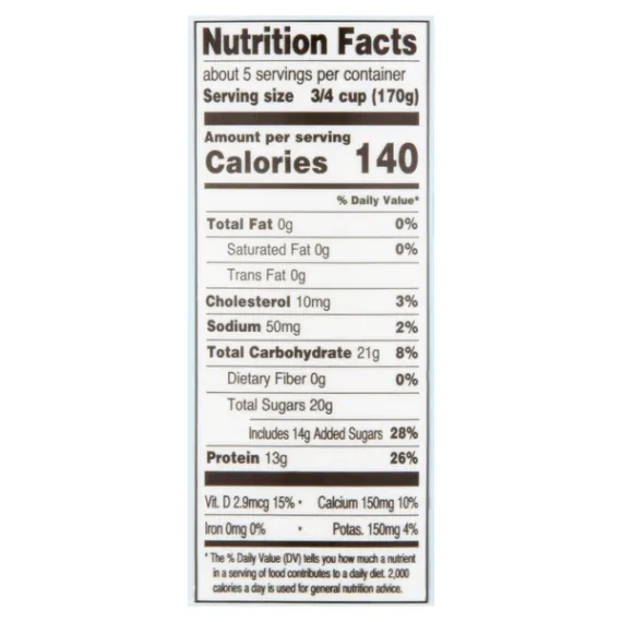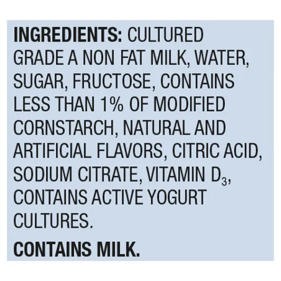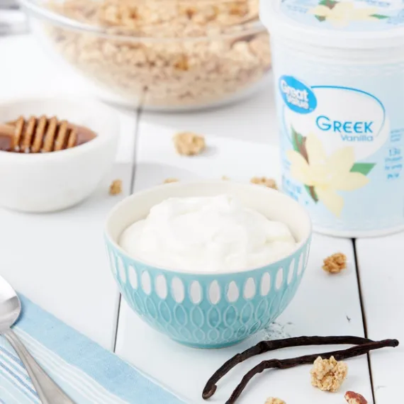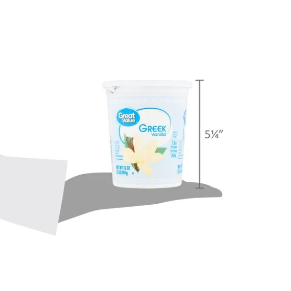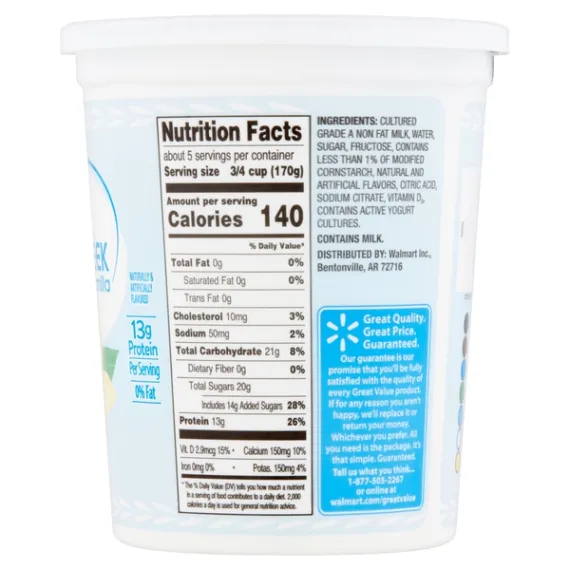 Details Ingredients CULTURED GRADE A NON FAT MILK, WATER, SUGAR, FRUCTOSE, CONTAINS LESS THAN 1% OF MODIFIED CORNSTARCH, NATURAL AND ARTIFICIAL FLAVORS, CITRIC ACID, SODIUM CITRATE, VITAMIN D3, CONTAINS ACTIVE YOGURT CULTURES. Show more Product features Enjoy a protein-packed breakfast to help you power through your day with Great Value Greek Vanilla Nonfat Yogurt. Greek yogurt is strained to remove most of the whey found in traditional yogurt, resulting in a thicker consistency, making it a perfect base for a variety of sweet treats. Get creative in the kitchen and use our Greek yogurt in between layers of angel food cake with sliced berries for a lighter take on a traditional dessert. You can even swirl it into smoothies to help keep you full and satisfied. Make your next meal more nutritious with Great Value Greek Vanilla Nonfat Yogurt. Great Value products provide families with affordable, high quality grocery and household consumable options. With our wide range of product categories spanning grocery and household consumables, we offer you a variety of products for your family's needs. Our products are conveniently available online and in Walmart stores nationwide, allowing you to stock up and save money at the same time. Nonfat Greek yogurt Vanilla flavor Vitamin D added 0% fat 13g protein per serving 32oz container Net Quantity of Content ABOUT 5 X 3/4 cup