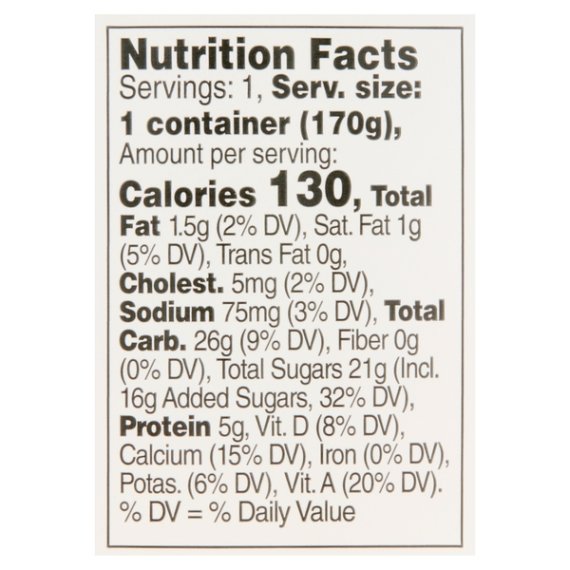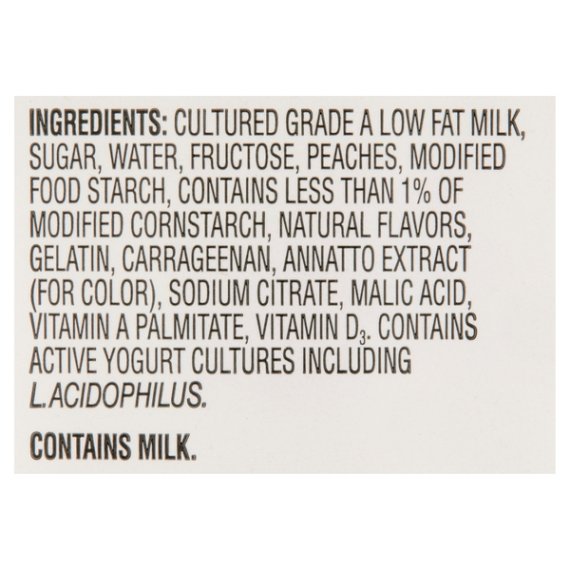 Details Ingredients CULTURED GRADE A LOW FAT MILK, SUGAR, WATER, FRUCTOSE, PEACHES, MODIFIED FOOD STARCH, CONTAINS LESS THAN 1% OF MODIFIED CORNSTARCH, NATURAL FLAVORS, GELATIN, CARRAGEENAN, ANNATTO EXTRACT (FOR COLOR), SODIUM CITRATE, MALIC ACID, VITAMIN A PALMITATE, VITAMIN D3. CONTAINS ACTIVE YOGURT CULTURES INCLUDING L. ACIDOPHILUS. Show more Product features Offer your family a creamy, sweet treat with Great Value Original Peach Lowfat Yogurt. This lowfat yogurt comes in four individually packaged servings, making them ideal for school lunches, family road trips, at the office, camping, and more! Combine with fruit and ice for a delicious breakfast smoothie or enjoy with granola or dried fruit for a well-balanced mid-day snack. Our yogurt is crafted with quality 1% lowfat milk with added vitamin A and D, making this treat a great choice for people who are being careful with their diet. Great Value Original Peach Lowfat Yogurt is a flavorful and healthy snack to keep you going throughout the day. Great Value products provide families with affordable, high quality grocery and household consumable options. With our wide range of product categories spanning grocery and household consumables, we offer you a variety of products for your family's needs. Our products are conveniently available online and in Walmart stores nationwide, allowing you to stock up and save money at the same time. Lowfat yogurt Vitamin A and D added 1% milk fat Peach flavor (4) 6oz individual cups 130 calories per serving Net Quantity of Content 1 X 170 g