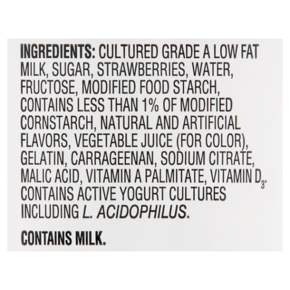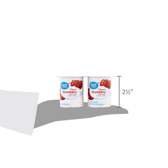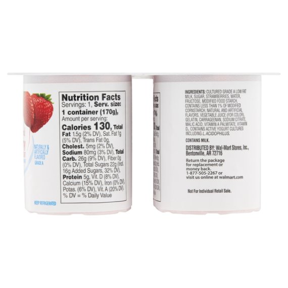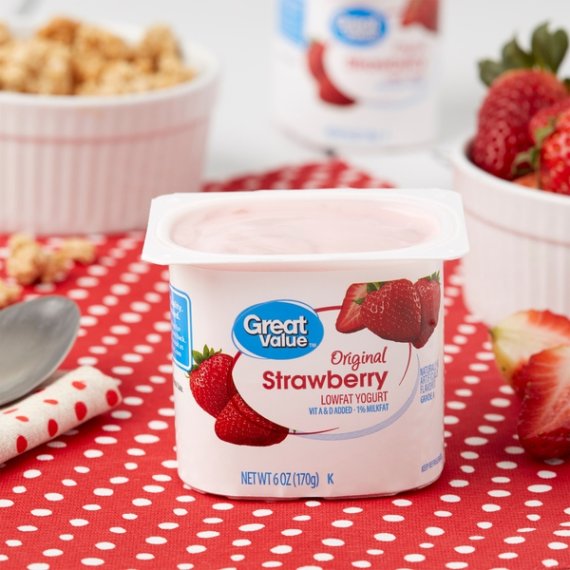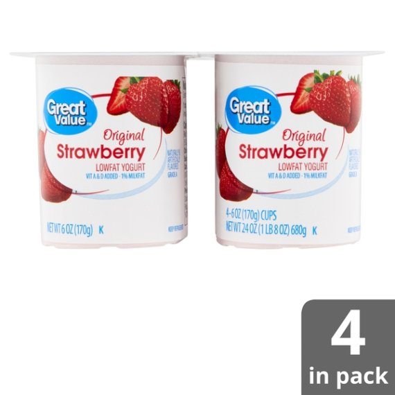 Details Ingredients CULTURED GRADE A LOW FAT MILK, SUGAR, STRAWBERRIES, WATER, FRUCTOSE, MODIFIED FOOD STARCH, CONTAINS LESS THAN 1% OF MODIFIED CORNSTARCH, NATURAL AND ARTIFICIAL FLAVORS, VEGETABLE JUICE (FOR COLOR), GELATIN, CARRAGEENAN, SODIUM CITRATE, MALIC ACID, VITAMIN A PALMITATE, VITAMIN D3. CONTAINS ACTIVE YOGURT CULTURES INCLUDING L. ACIDOPHILUS. Show more Product features Offer your family a creamy, sweet treat with Great Value Original Strawberry Lowfat Yogurt. This lowfat yogurt comes in four individually packaged servings, making them ideal for school lunches, family road trips, at the office, camping, and more! Flex your culinary prowess by freezing our yogurt, combining with sugar and lemon juice, and blending together to create a satisfying, nutritious frozen yogurt that's fast and easy to make. Our yogurt is crafted with quality 1% lowfat milk with added vitamin A and D, making this treat a great choice for people who are being careful with their diet. Great Value Original Strawberry Lowfat Yogurt is a flavorful and healthy snack to keep you going throughout the day. Great Value products provide families with affordable, high quality grocery and household consumable options. With our wide range of product categories spanning grocery and household consumables, we offer you a variety of products for your family's needs. Our products are conveniently available online and in Walmart stores nationwide, allowing you to stock up and save money at the same time. Lowfat yogurt Vitamin A and D added 1% milk fat Strawberry flavor (4) 6oz individual cups 130 calories per serving Net Quantity of Content 1 X 170 g