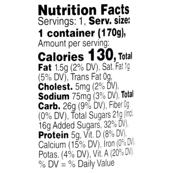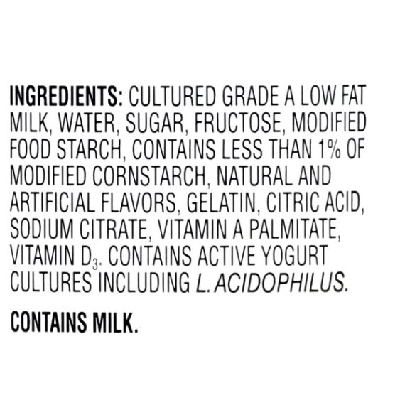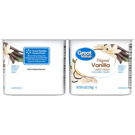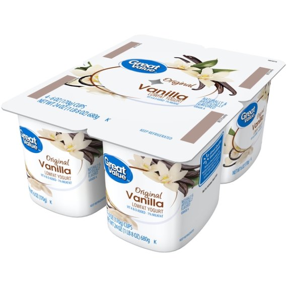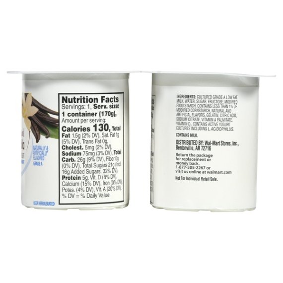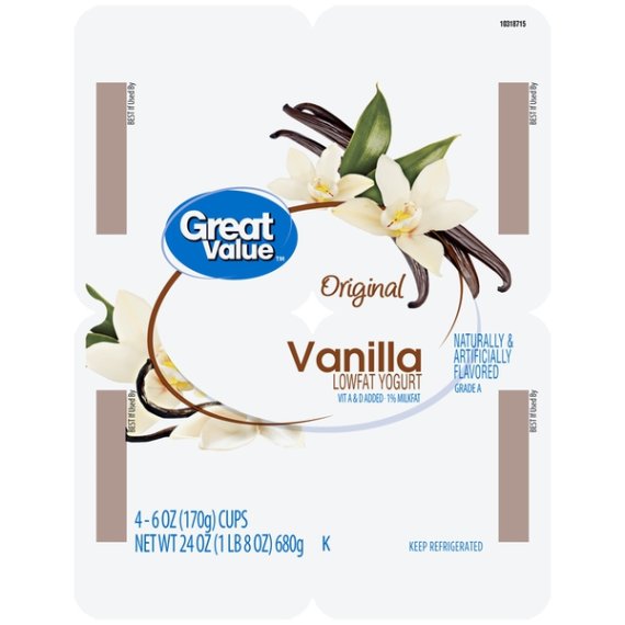 Details Ingredients CULTURED GRADE A LOW FAT MILK, WATER. SUGAR, FRUCTOSE, MODIFIED FOOD STARCH, CONTAINS LESS THAN 1% OF MODIFIED CORN STARCH, KOSHER GELATIN, NATURAL AND ARTIFICIAL FLAVORS, ANNATTO EXTRACT (FOR COLOR), CARAMEL COLOR, CITRIC ACID, POTASSIUM SORBATE (TO MAINTAIN FRESHNESS), SODIUM CITRATE, VITAMIN A PALMITATE, VITAMIN D3. CONTAINS ACTIVE YOGURT CULTURES INCLUDING L. ACIDOPHILUS. Show more Product features Enjoy a sweet, creamy treat with Great Value Original Vanilla Lowfat Yogurt. This lowfat yogurt comes in 4 individually packaged servings, making them ideal for school and office lunches, camping, family road trips, and more! Mix with fruit and granola or blend into smoothies for a satisfying, nutritious meal that's fast and easy to make. Our yogurt is crafted with quality 1% lowfat milk with added vitamin A and D, making this treat a great choice for people who are being careful with their diet. Great Value Original Vanilla Lowfat Yogurt is a flavorful and healthy snack to keep you going. Great Value products provide families with affordable, high quality grocery and household consumable options. With our wide range of product categories spanning grocery and household consumables, we offer you a variety of products for your family's needs. Our products are conveniently available online and in Walmart stores nationwide, allowing you to stock up and save money at the same time. Lowfat yogurt Vitamin A and D added 1% milk fat (4) 6oz individual cups 130 calories per serving Net Quantity of Content 4 X 6 oz