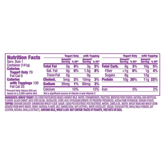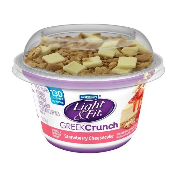 Details Ingredients Nonfat Yogurt: Cultured Pasteurized Grade A Nonfat Milk, Water, Strawberries, Fructose, Modified Food Starch, Natural and Artificial Flavors, Black Carrot Juice (For Color), Sucralose, Citric Acid, Potassium Sorbate (To Preserve Freshness), Acesulfame Potassium, Sodium Citrate. Topping: Graham Cracker (Unenriched Wheat Flour, Sugar, Liquid Polydextrose (Polydextrose, Water), Canola Oil, Water, Wheat Bran and Wheat Germ Derived from White Wheat, Honey, Natural Flavor, Salt, Baking Soda, Soy Lecithin.), White Chocolate (Sugar, Cocoa Butter, Whole Milk Powder, Soy Lecithin, Natural Vanilla Extract). Contains: Milk, Wheat & Soy. May contain traces of Peanuts, Tree Nuts or Eggs. Show more Product features Your favorite Light & Fit Nonfat Greek Strawberry cheesecake yogurt paired with luxurious white chocolate and the perfect graham cracker crunch. Its a match made in heaven. Light & Fit Crunch Fat-Free Greek Strawberry Cheesecake Yogurt, 5 oz., cup: 80 calories per 5.3oz serving 40% fewer calories than regular lowfat yogurt 0% fat 2x the protein of regular lowfat yogurt Kosher Net Quantity of Content 1 X 141 g