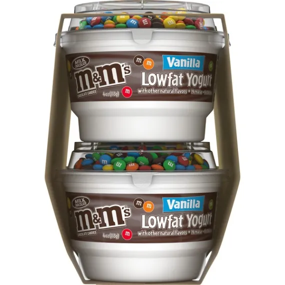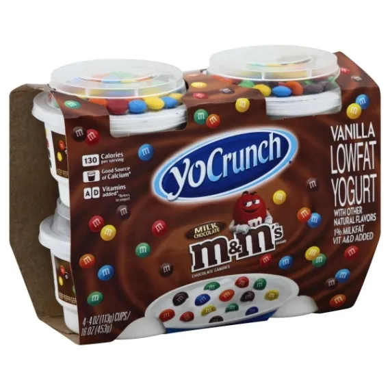 Details Ingredients Lowfat Yogurt: Cultured Pasteurized Grade A Lowfat Milk, Sugar, Food Starch - Modified, Natural Flavors, Potassium Sorbate (To Preserve Freshness), Vitamin A Palmitate, Vitamin D3. Show more Product features Yogurt, Vanilla, M&M's Milk Chocolate, Lowfat, 4 Pack, Sleeve 4 OZ With other natural flavors. 1% milkfat. Vit A & D added. 130 calories per serving. Good source of calcium (refers to yogurt). A/D vitamins added (refers to yogurt). Great taste of vanilla yogurt. Swirl in the colorful fun of M&M's Chocolate Candies. Yogurt is a good source of calcium. Great with a meal or as a snack on the go. Great yogurt, real fun! Facebook/Twitter: Join the fun at YoCrunch.com. Facebook.com/YoCrunchYogurt. Twitter.com/YoCrunch. Contains active yogurt cultures including L. acidophilus & bifidus. Partially produced with genetic engineering. Your comments count, call 1-866-YoCrunch. Please provide time and date stamped info from tops of cups when contacting us. Our yogurt is made with milk from cows not treated with rBST (No significant difference has been shown between milk derived from r-BST-treated and non-rBST-treated cows). Grade A. Keep refrigerated. Contains milk & soy. May contain traces of wheat, peanuts, tree nuts or eggs. 4 - 4 oz (113 g) cups [16 oz (453 g)] Naugatuck, CA 06770 866-YOCRUNCH Mars Inc. Yogurt, Lowfat, Vanilla, Milk Chocolate M&M's Chocolate Candies With other natural flavors. 1% milkfat. Vit A & D added. 130 calories per serving. Good source of calcium (refers to yogurt). A/D vitamins added (refers to yogurt). Great taste of vanilla yogurt. Swirl in the colorful fun of M&M's Chocolate Candies. Yogurt is a good source of calcium. Great with a meal or as a snack on the go. Great yogurt, real fun! Facebook/Twitter: Join the fun at YoCrunch.com. Facebook.com/YoCrunchYogurt. Twitter.com/YoCrunch. Contains active yogurt cultures including L. acidophilus & bifidus. Partially produced with genetic engineering. Your comments count, call 1-866-YoCrunch. Please provide time and date stamped info from tops of cups when contacting us. Our yogurt is made with milk from cows not treated with rBST (No significant difference has been shown between milk derived from r-BST-treated and non-rBST-treated cows). Grade A. Net Quantity of Content 4 X 113 g