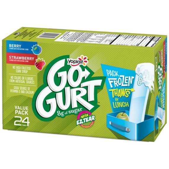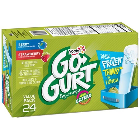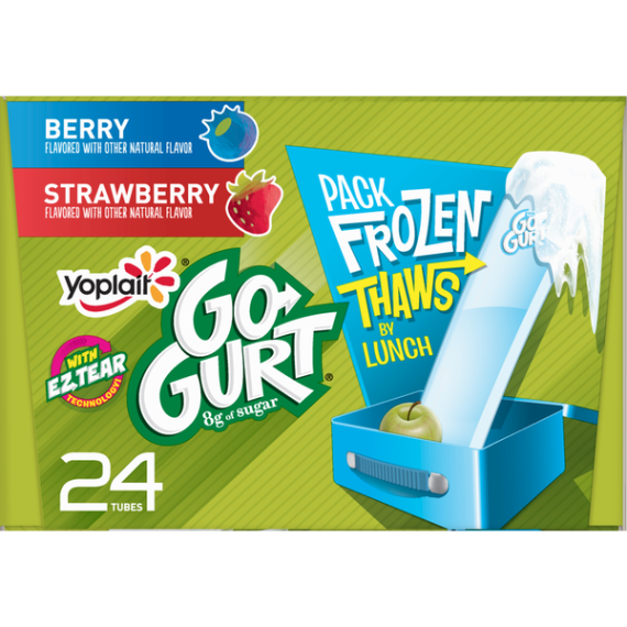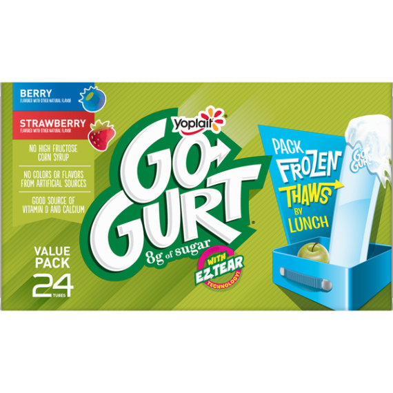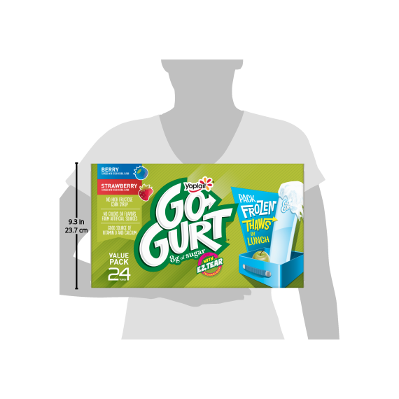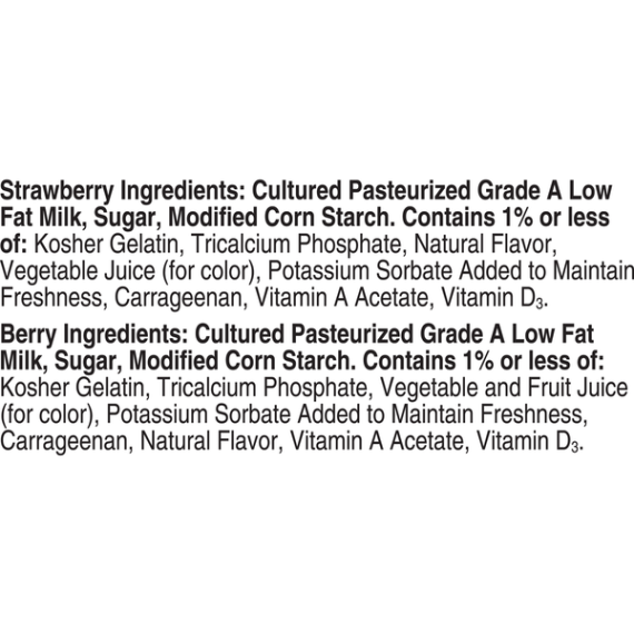 Details Ingredients Strawberry: Cultured Pasteurized Grade A Low Fat Milk, Sugar, Modified Corn Starch, Contains 1% or Less of: Kosher Gelatin, Tricalcium Phosphate, Natural Flavor, Vegetable Juice (for Color), Potassium Sorbate Added to Maintain Freshness, Carrageenan, Vitamin A Acetate, Vitamin D3.Berry: Cultured Pasteurized Grade A Low Fat Milk, Sugar, Modified Corn Starch, Contains 1% or Less of: Kosher Gelatin, Tricalcium Phosphate, Vegetable and Fruit Juice (for Color), Potassium Sorbate Added to Maintain Freshness, Carrageenan, Natural Flavor, Vitamin A Acetate, Vitamin D3. Show more Product features Yoplait Go-GURT variety pack of Berry and Strawberry low fat yogurt tubes is gluten free, a good source of vitamin D and calcium and is made with no high fructose corn syrup, and no colors or flavors from artificial sources. GO-GURT yogurt is perfect for on-the-go breakfast or snack. This box contains 12 tubes of each flavor. This delicious, low fat, gluten free kids yogurt is made for kids and parent approved. Yoplait Go-GURT is creamy, tasty yogurt in a tube. Grab one of our great tasting flavors as a convenient snack on the go, or to add as a lunchbox snack. Each tube is one serving of fun, with characters, jokes, and games to enjoy! Yoplait Go-GURT is a good source of vitamin D and calcium, and is made with no high fructose corn syrup and does not contain artificial colors or flavors from artificial sources. Creamy and delicious kids berry & strawberry yogurt tubes for the perfect breakfast or on-the-go snack. This delicious kids yogurt is gluten free and contains no artificial flavors, no high fructose corn syrup and no colors from artificial sources; Easy to open kids yogurt tubes are a serving of fun, with characters, jokes, and games for your family to enjoy Explore all our delicious kids yogurt varieties and flavors Explore all our Yoplait varieties and flavors Value Pack Net Quantity of Content 24 X 1 tube (56g)