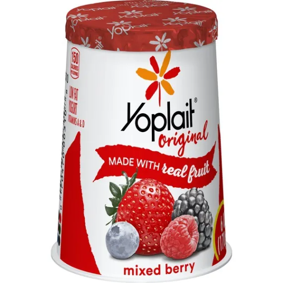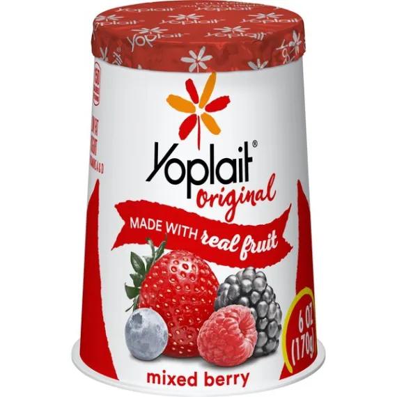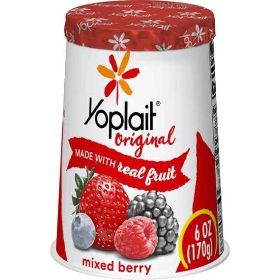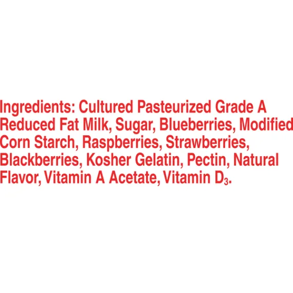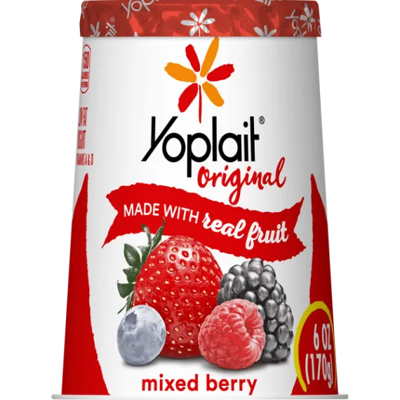 Details Ingredients Cultured Pasteurized Grade A Reduced Fat Milk, Sugar, Blueberries, Modified Corn Starch, Raspberries, Strawberries, Blackberries, Kosher Gelatin, Pectin, Natural Flavor, Vitamin A Acetate, Vitamin D3. Show more Product features Yoplait Original Mixed Berry flavor is a smooth, creamy delicious yogurt with no high fructose corn syrup and no colors or flavors from artificial sources. A gluten free option that is perfect for breakfast or snack. Thanks for choosing this specifically crafted tub of Yoplait! Since 1965, we’ve been making sure every spoonful of Yoplait is always smooth, creamy and delicious. So grab your spoon and dive right in – we hope you and your family enjoy every bite! Yoplait Original: Creamy original mixed berry yogurt for the perfect breakfast on the go or afternoon snack. Made With Goodness: Mixed berry yogurt contains no artificial flavors, no high fructose corn syrup and no colors from artificial sources. Protein Packed: Yoplait yogurt is packed with 6g of protein per serving. Low Calorie: Low fat yogurt has 150 calories per serving and the same smooth, delicious Yoplait taste. Explore all our Yoplait varieties and flavors Special Features Vitamins a and d Net Quantity of Content 1 X 170.0