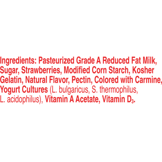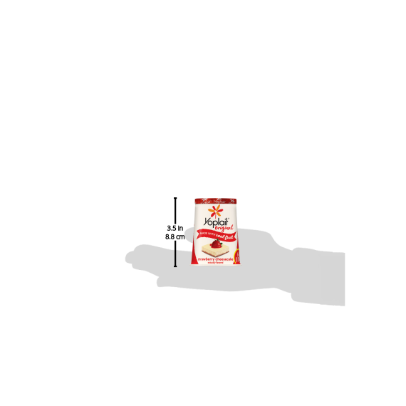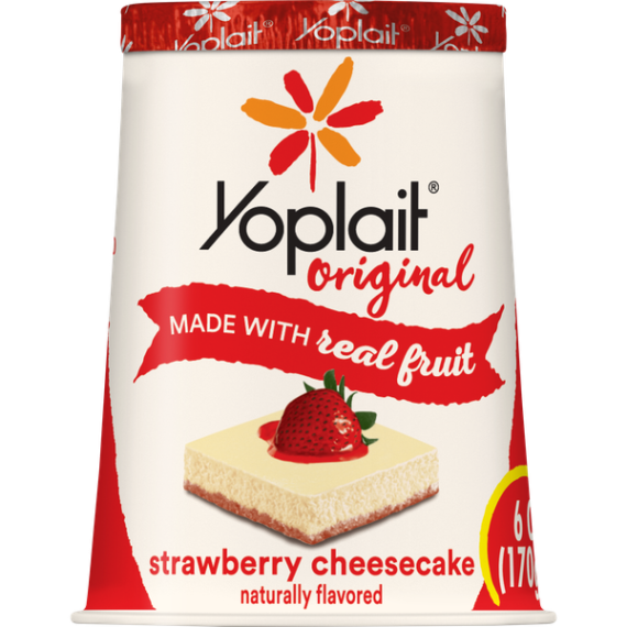 Details Ingredients Pasteurized Grade A Reduced Fat Milk, Sugar, Strawberries, Modified Corn Starch, Kosher Gelatin, Natural Flavor, Pectin, Colored with Carmine, Yogurt Cultures (L. Bulgaricus, S. Thermophilus, L. Acidophilus), Vitamin A Acetate, Vitamin D3. Show more Product features You can't beat an original, especially when it's as smooth, creamy and delicious as Yoplait. It's Low Fat, Gluten Free and has No High Fructose Corn Syrup, No Artificial Flavors or No Colors From Artificial Sources. Thanks for choosing this specifically crafted tub of Yoplait! Since 1965, we’ve been making sure every spoonful of Yoplait is always smooth, creamy and delicious. So grab your spoon and dive right in – we hope you and your family enjoy every bite! Yoplait Original: Creamy original strawberry cheesecake yogurt for the perfect breakfast on the go or afternoon snack. Made With Goodness: Strawberry cheesecake yogurt contains no artificial flavors, no high fructose corn syrup and no colors from artificial sources. Protein Packed: Yoplait yogurt is packed with 6g of protein per serving. Low Calorie: Low fat yogurt has 150 calories per serving and the same smooth, delicious Yoplait taste. Explore all our Yoplait varieties and flavors Special Features Vitamins a and d Net Quantity of Content 1 X 1.0