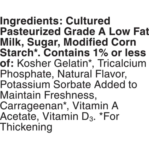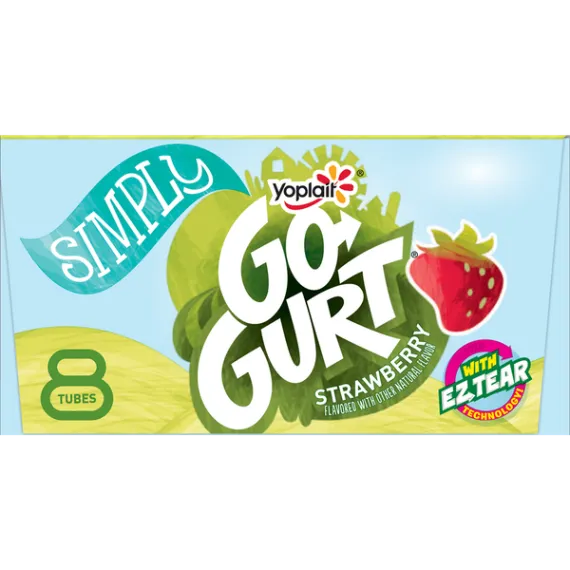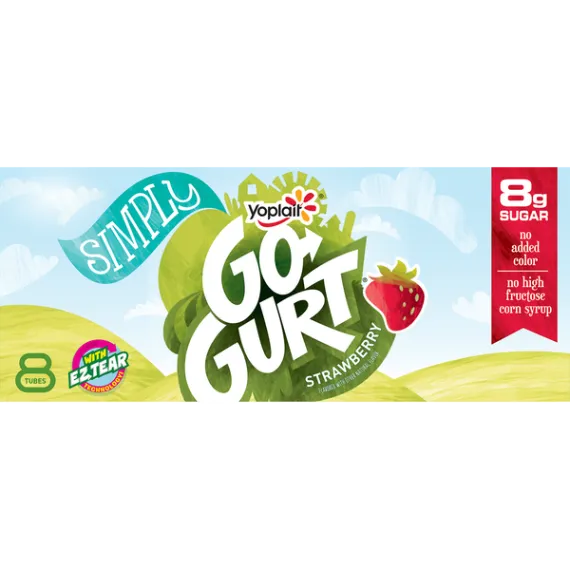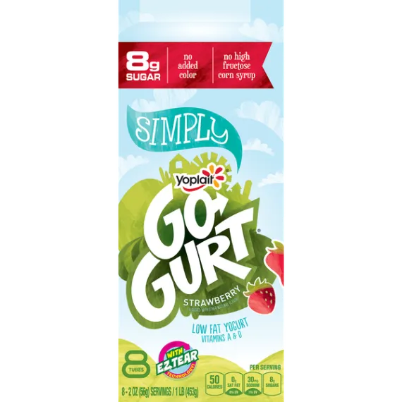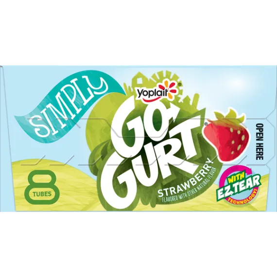 Details Ingredients Cultured Pasteurized Grade A Low Fat Milk, Sugar, Modified Corn Starch*. Contains 1% or Less of: Kosher Gelatin*, Tricalcium Phosphate , Natural Flavor, Potassium Sorbate Added to Maintain Freshness, Carrageenan*, Vitamin A Acetate, Vitamin D3.*For Thickening. Show more Product features Yoplait Go-GURT Strawberry flavor, portable low fat yogurt tubes is gluten free, a good source of vitamin D and calcium and is made with no high fructose corn syrup, and no colors or flavors from artificial sources. Perfect for on-the-go breakfast or snack. The box contains 8 tubes. EZ Open Tubes made with lasers.Go-GURT worked with a cutting-edge packaging company to improve the Go-GURT tube. The new tubes feature EZ Tear Technology, so "tear here" is a guarantee - not a challenge. Fearlessly pack Go-GURT in every lunch box. Heroically bring a box of Go-GURT for the after-game snack, because now there is no struggle to get those things open. Yoplait Go-Gurt: Creamy strawberry yogurt for the perfect breakfast or afternoon snack. Made With Goodness: Yoplait yogurt contains no artificial flavors, no high fructose corn syrup and no colors from artificial sources; Gluten Free. On-the-Go: Easy to open tube filled with delicious yogurt is a good source of Calcium + Vitamin D and a fun on-the-go snack kids will love. Contains: Yogurt has 8g of sugar. Explore all our Yoplait varieties and flavors Net Quantity of Content 8 X 1 tube (56g)
