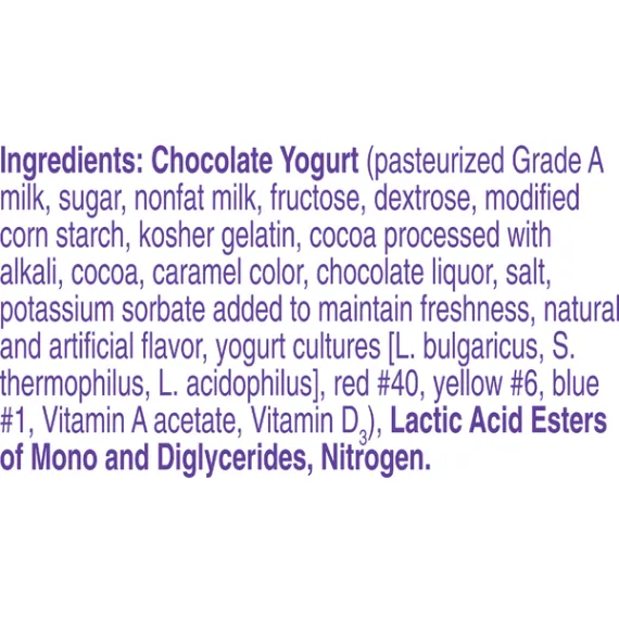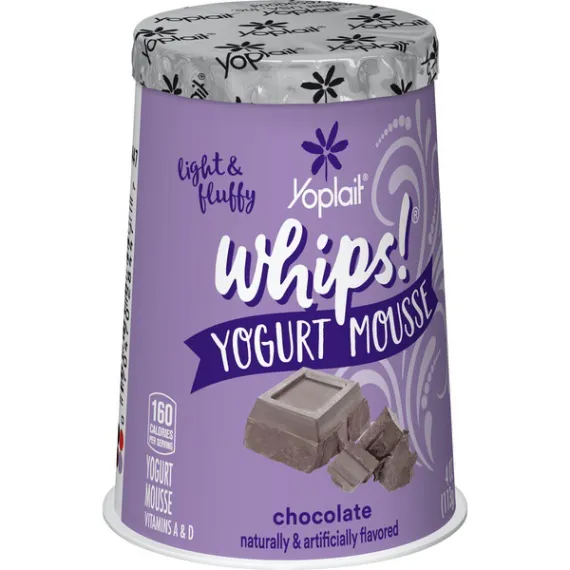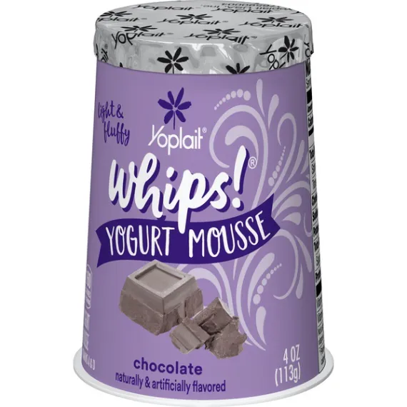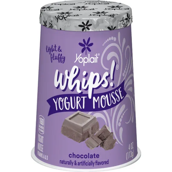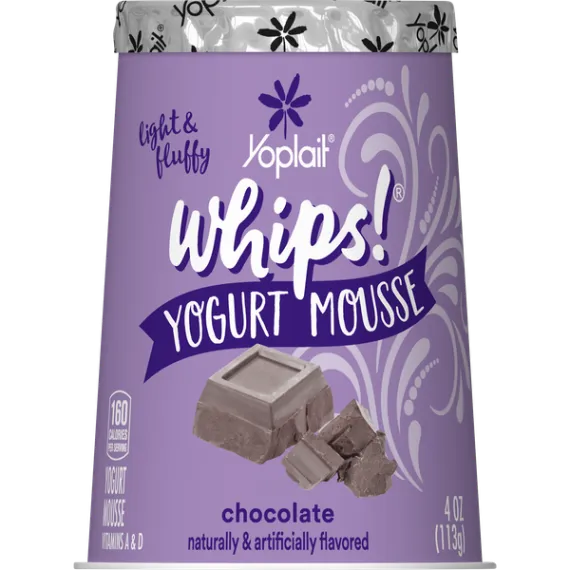 Details Ingredients Chocolate Yogurt (Pasteurized Grade A Milk, Sugar, Nonfat Milk, Fructose, Dextrose, Modified Corn Starch, Kosher Gelatin, Cocoa Processed with Alkali, Cocoa, Caramel Color, Chocolate Liquor, Salt, Potassium Sorbate Added to Maintain Freshness, Natural and Artificial Flavor, Yogurt Cultures [L. Bulgaricus, S. Thermophilus, L. Acidophilus], Red #40, Yellow #6, Blue #1, Vitamin A Acetate, Vitamin D3), Lactic Acid Esters of Mono and Diglycerides, Nitrogen. Show more Product features Yoplait Chocolate Whips is a gluten free yogurt mousse with a light, airy texture. Contains no high fructose corn syrup . Great option for breakfast or a snack Packed with flavor, this lowfat and gluten free yogurt is the ultimate afternoon indulgence that you don't have to feel guilty about enjoying. It all started in France in 1965 when a group of farmers from six dairy co-ops came together for a greater good. These dairy devotees saw the future and the need to get dairy to a population slowly leaving the rolling hills of farmland for the rows of suburbs and lines of urban streets. They took their French cows, taste and love for yogurt and through a quick merge of the names of the two lead co-ops Yola and Coplait – Yoplait was born. Creamy chocolate mousse yogurt for the perfect breakfast on the go or afternoon snack No high fructose corn syrup; gluten free Contains live and active cultures We only use the best ingredients and always strive to source ingredients that are sustainable Explore all our Yoplait varieties and flavors Special Features Vitamins a and d Net Quantity of Content 1 X 1 Container