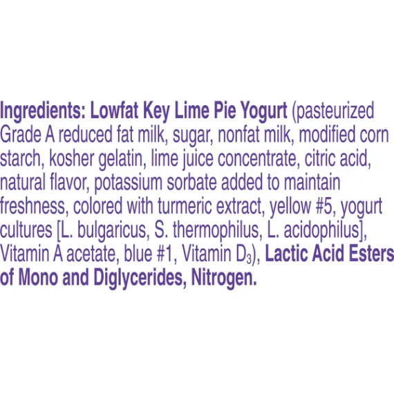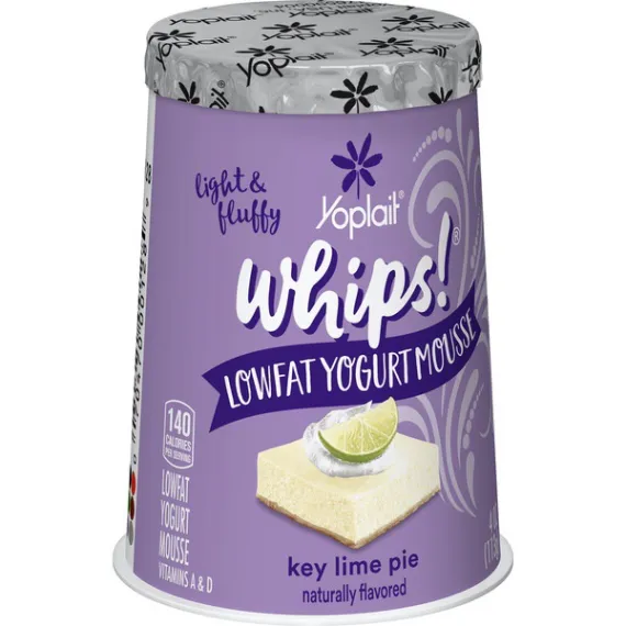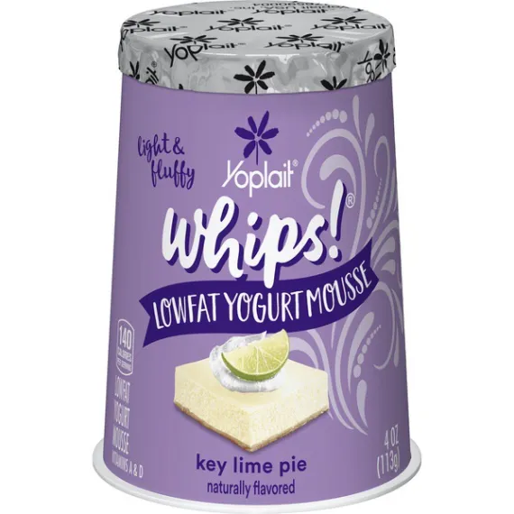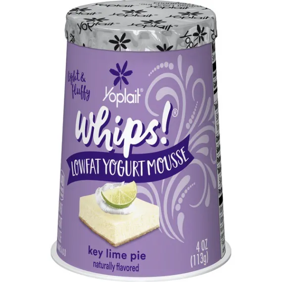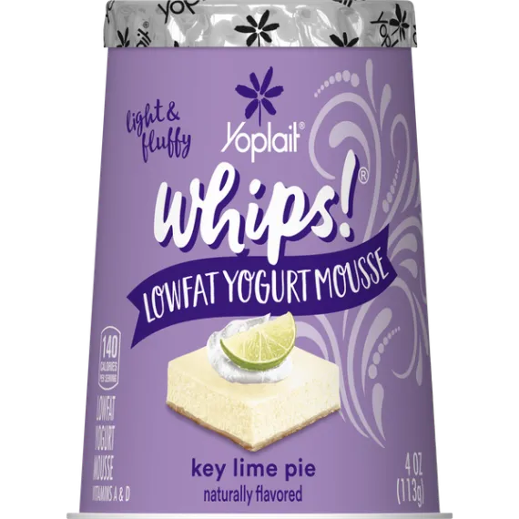 Details Ingredients Lowfat Key Lime Pie Yogurt (Pasteurized Grade A Reduced Fat Milk, Sugar, Nonfat Milk, Modified Corn Starch, Kosher Gelatin, Lime Juice Concentrate, Citric Acid, Natural Flavor, Potassium Sorbate Added to Maintain Freshness, Colored with Turmeric Extract, Yellow #5, Yogurt Cultures [L. Bulgaricus, S. Thermophilus, L. Acidophilus], Vitamin A Acetate, Blue #1, Vitamin D3), Lactic Acid Esters of Mono and Diglycerides, Nitrogen. Show more Product features Yoplait Whips! Key Lime Yogurt Mousse turns regular yogurt into a fluffy mousse-styled version of Yoplait succulence sure to satisfy even the most discerning sweet tooth. Naturally Gluten Free and with no artificial flavors, colors from artificial sources or high fructose corn syrup; Indulgent treats have never been SO good!Try Yoplait Whips! frozen. Creamy key lime pie mousse yogurt for the perfect breakfast on the go or afternoon snack No artificial flavors and no high fructose corn syrup; gluten free Contains live and active cultures We only use the best ingredients and always strive to source ingredients that are sustainable Explore all our Yoplait varieties and flavors No Artificial Flavors Special Features Vitamins a and d Net Quantity of Content 1 X 1 Container