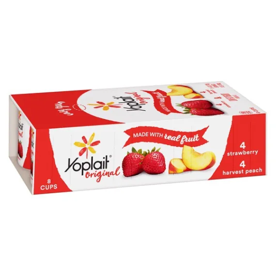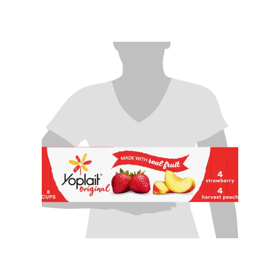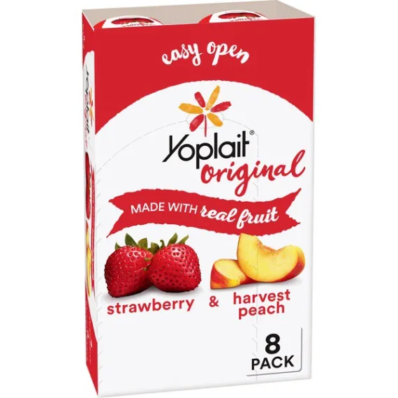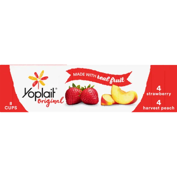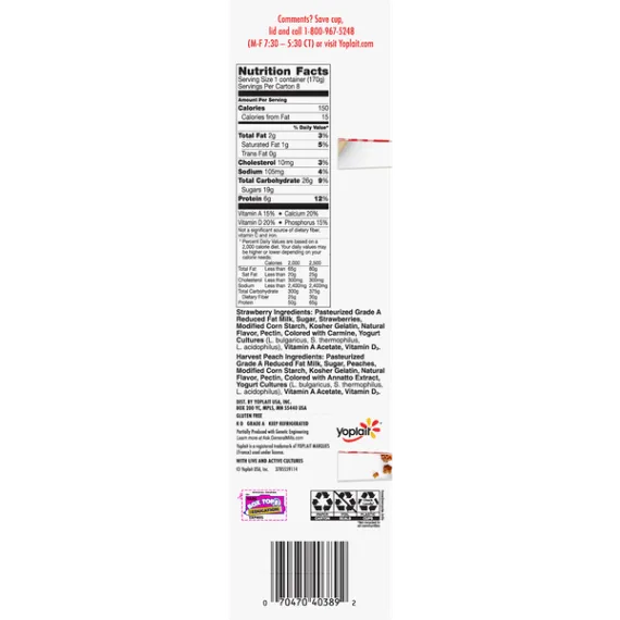Details Ingredients Strawberry: Cultured Pasteurized Grade A Reduced Fat Milk, Sugar, Strawberries, Modified Corn Starch, Kosher Gelatin, Natural Flavor, Colored with Carmine, Pectin, Vitamin A Acetate, Vitamin D3.Harvest Peach: Cultured Pasteurized Grade A Reduced Fat Milk, Sugar, Peaches, Modified Corn Starch, Kosher Gelatin, Natural Flavor, Pectin, Colored with Annatto Extract, Vitamin A Acetate, Vitamin D3. Show more Product features Yoplait Original variety pack of Strawberry and Harvest Peach flavors. A smooth, creamy delicious yogurt with no high fructose corn syrup and no colors or flavors from artificial sources. A gluten free option that is perfect for breakfast or snack. 4 cups of each flavor. Perfect for the whole family, there are plenty of occasions to enjoy this delicious yogurt! Both flavors in the variety pack are a great choice for everyone in your family.Every spoonful of Yoplait is always smooth, creamy and delicious. So grab your spoon and dive right in – we hope you and your family enjoy every bite! Variety Pack: Creamy original strawberry and harvest peach yogurt for the perfect breakfast on the go or afternoon snack. Made With Goodness: Yogurt contains no artificial flavors, no high fructose corn syrup and no colors from artificial sources. Protein Packed: Yoplait yogurt is packed with 6g of protein per serving. Low Calorie: Low fat yogurt has 150 calories per serving and the same smooth, delicious Yoplait taste. Explore all our Yoplait varieties and flavors Net Quantity of Content 8 X 170.0