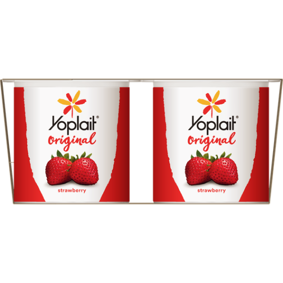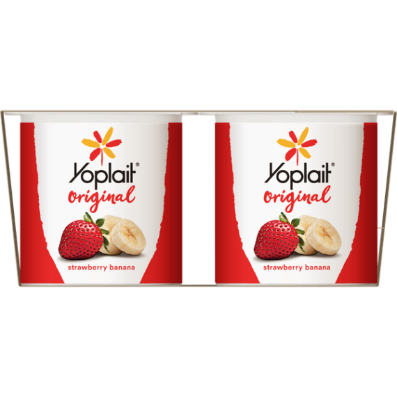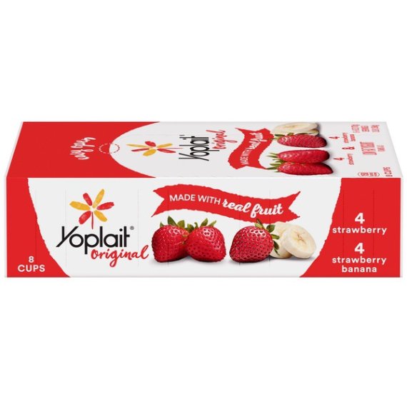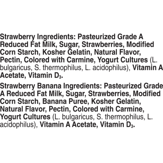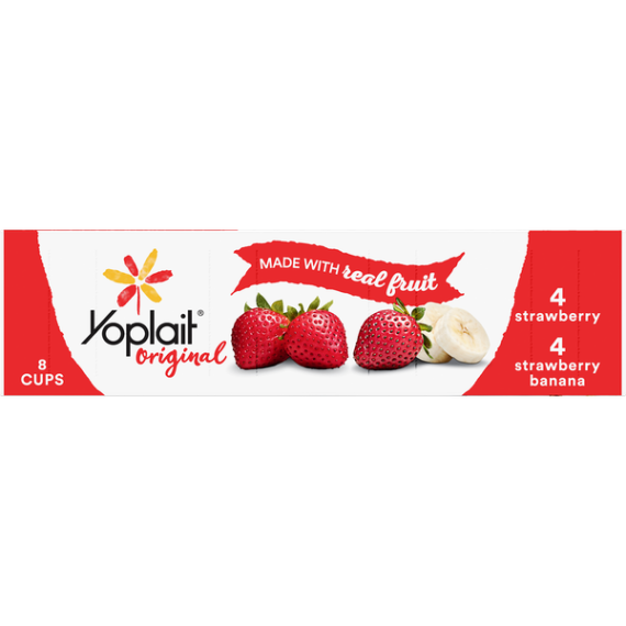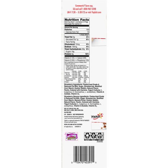Details       Ingredients  Strawberry: Cultured Pasteurized Grade A Reduced Fat Milk, Sugar, Strawberries, Modified Corn Starch, Kosher Gelatin, Natural Flavor, Colored with Carmine, Pectin, Vitamin A Acetate, Vitamin D3.Strawberry Banana: Cultured Pasteurized Grade A Reduced Fat Milk, Sugar, Strawberries, Modified Corn Starch, Banana Puree, Kosher Gelatin, Natural Flavor, Pectin, Colored with Carmine, Vitamin A Acetate, Vitamin D3.      Show more      Product features   FLAVORS FOR ALL: Original Yoplait in the flavors your family loves: strawberry and strawberry banana!      Variety Pack: Creamy original strawberry and strawberry banana yogurt for the perfect breakfast on the go or afternoon snack.   Made With Goodness: Yogurt contains no artificial flavors, no high fructose corn syrup and no colors from artificial sources.   Protein Packed: Yoplait yogurt is packed with 6g of protein per serving.   Low Calorie: Low fat yogurt has 150 calories per serving and the same smooth, delicious Yoplait taste.   Explore all our Yoplait varieties and flavors       Net Quantity of Content   4 X 1.0
