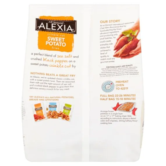 Details Ingredients SWEET POTATOES, VEGETABLE OIL (CONTAINS ONE OR MORE OF THE FOLLOWING: HIGH OLEIC CANOLA, CANOLA, SUNFLOWER), RICE FLOUR, CANE SUGAR, TAPIOCA STARCH, DEXTRIN, CORN STARCH, SEA SALT, BLACK PEPPER, ONION POWDER, GARLIC POWDER, SALAD MUSTARD POWDER (DISTILLED VINEGAR, MUSTARD SEED, SALT, TURMERIC, PAPRIKA), NATURAL FLAVORS, SPICE, GLUCONIC ACID, XANTHAN GUM. Show more Product features Fries, Sweet Potato, Crinkle Cut, Bag 20 OZ With sea salt and black pepper. All natural. Perfectly seasoned. 0 g trans fat per serving. See side panel for nutrition information. Non GMO Project verified. nongmoproject.org. A perfect blend of sea salt and crushed black pepper on a sweet potato crinkle cut fry. Nothing beats a great fry. At Alexia, we've updated classic crinkle cuts with a sweet potato twist. Then we seasoned them with just the right amount of sea salt and crushed black pepper to give them that delicious savory crunch fit for any meal. Try Alexia's all-natural potatoes, breads and appetizers. Our Story: At acclaimed international restaurants, Chef Alex discovered that by hand-selecting the finest all-natural ingredients and producing only small batches, he could create everyday side dishes that achieved a level of quality to match most any gourmet entree. No cholesterol. Connect with us: See how our products rate and write your own review at alexiafoods.com. Facebook. Visit us at facebook.com/alexiafoods. Have a question or comment? Visit us at alexiafoods.com or call Monday - Friday, 9:00 am - 7:00 pm (CST), 1-866-484-8676 (except national holidays). Please have entire package available when you call. Contact with us: See how our products rate and write your own review at alexiafoods.com. Facebook. Visit us at facebook.com/alexiafoods. Product of USA. Keep frozen. For Food Safety and Quality: Keep frozen. Do not thaw. Ovens vary. Adjust cooking times as needed. Product must be cooked thoroughly. Internal temperature needs to reach 165 degrees F as measured by a food thermometer in several spots. Read and follow these cooking directions. For more information go to alexiafoods.com or call 1-866-484-8676. Preheat oven to 425 degrees F. Full bag 22-26 minutes. Half bag 15-18 minutes. Arrange frozen potatoes in a single layer on an 11 x 17 inch baking sheet. Bake according to instructions above to desired color and crispness, stirring halfway through cooking time. 20 oz (1.25 lb) 566 g Kennewick, WA 99336 866-484-8676 Alexia Foods Fries, Crinkle Cut, Sweet Potato With sea salt and black pepper. All natural. Perfectly seasoned. 0 g trans fat per serving. See side panel for nutrition information. Non GMO Project verified. nongmoproject.org. A perfect blend of sea salt and crushed black pepper on a sweet potato crinkle cut fry. Nothing beats a great fry. At Alexia, we've updated classic crinkle cuts with a sweet potato twist. Then we seasoned them with just the right amount of sea salt and crushed black pepper to give them that delicious savory crunch fit for any meal. Try Alexia's all-natural potatoes, breads and appetizers. Our Story: At acclaimed international restaurants, Chef Alex discovered that by hand-selecting the finest all-natural ingredients and producing only small batches, he could create everyday side dishes that achieved a level of quality to match most any gourmet entree. No cholesterol. Connect with us: See how our products rate and write your own review at alexiafoods.com. Facebook. Visit us at facebook.com/alexiafoods. Have a question or comment? Visit us at alexiafoods.com or call Monday - Friday, 9:00 am - 7:00 pm (CST), 1-866-484-8676 (except national holidays). Please have entire package available when you call. Contact with us: See how our products rate and write your own review at alexiafoods.com. Facebook. Visit us at facebook.com/alexiafoods. Product of USA. Net Quantity of Content ABOUT 7 X 3 oz