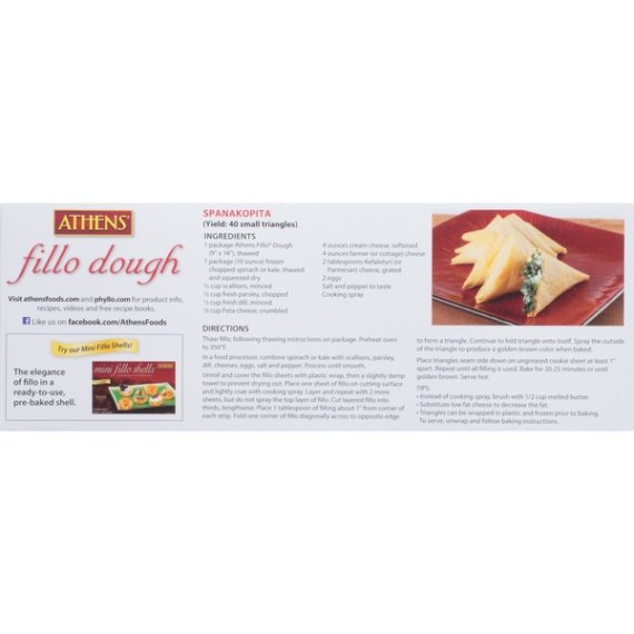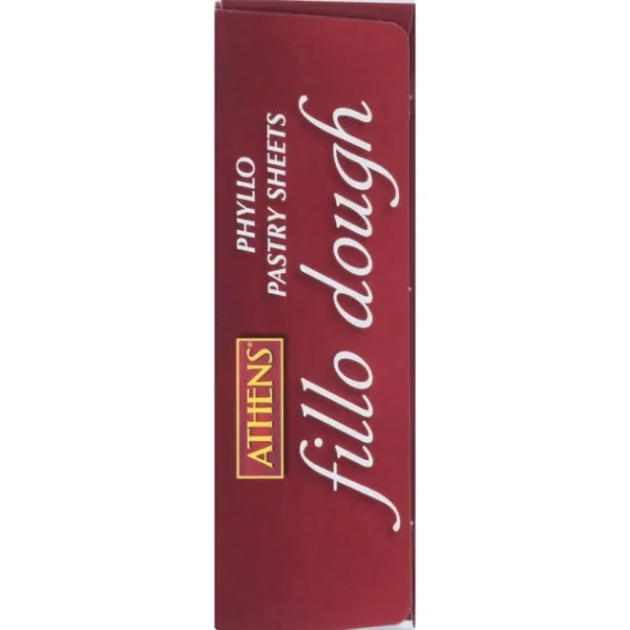 Details Ingredients ENRICHED WHEAT FLOUR (WHEAT FLOUR, NIACIN, IRON, THIAMIN MONONITRATE, RIBOFLAVIN, FOLIC ACID), WATER, CORN STARCH, DEXTROSE, MALTODEXTRIN, SALT, CANOLA OIL, PRESERVATIVES (CALCIUM PROPIONATE, SODIUM PROPIONATE, POTASSIUM SORBATE). Show more Product features Create dozens of delectable Greek and Middle Eastern dishes with Athens Phyllo Pastry Sheets. Athens has been America's premium fillo for over 50 years, making cooking exotic dishes much, much easier than starting from scratch. These special sheets are essential for everything from savory Spanakopita and meat pies to sweet treats like baclava and bird's nets and more. The fillo dough pastry sheets are pre-made and ready to stuff with your favorite fillings, bake and serve. They contain no trans fat or cholesterol. Each 16 oz box contains two easy-to-use rolls. Athens Phyllo Pastry Sheets Fillo Dough 16 Oz Box: Athens fillo dough pastry sheets New look, same great taste Two easy-to-use rolls No trans fat No cholesterol America's premium fillo for over 50 years For more recipes visit athensfoods.com and phyllo.com: Visit www.athensfoods.com for: product info, recipes, videos and free recipe books Visit www.phyllo.com to: Discuss phyllo (fillo), share and rate recipes and ask questions Athens and Athens Fillo are registered trademarks of Athens Foods, Inc. Approx. 40 (9"X14") fillo sheets; 20 per 8 oz roll Recipe: Spanakopita on box Special Features No trans fat or cholesterol Net Quantity of Content ABOUT 8 X 57 g