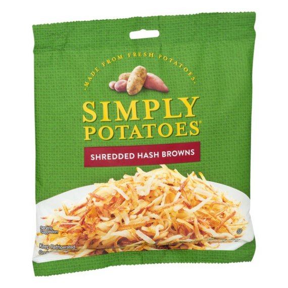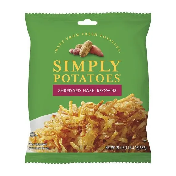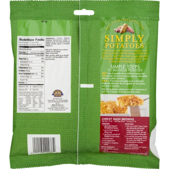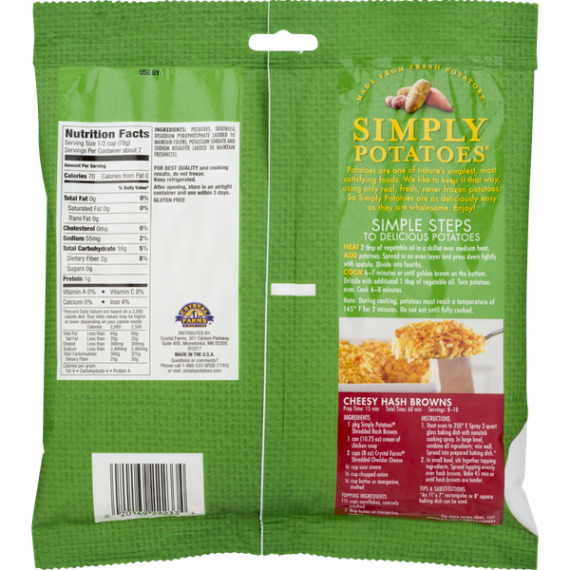 Details Ingredients POTATOES, DEXTROSE, DISODIUM PYROPHOSPHATE (ADDED TO MAINTAIN COLOR), POTASSIUM SORBATE AND SODIUM BISULFITE (ADDED TO MAINTAIN FRESHNESS). Show more Product features Hash Browns, Shredded, Bag 20 OZ Made from fresh potatoes. Gluten free. Since 1926. Questions or comments? Please call 1-866-533-Spud (7783) or visit: SimplyPotatoes.com. Potatoes are one of nature's simplest, most satisfying foods. We like to keep it that way, using only real, fresh, never frozen potatoes. So Simply Potatoes are as deliciously easy as they are wholesome. Enjoy! Keep refrigerated. Cook before serving. For best quality and cooking results, do not freeze. Keep refrigerated. After opening, store in an airtight container and use within 3 days. Simple Steps to Delicious Potatoes: Heat 2 tbsp of vegetable oil in a skillet over medium heat. Add potatoes. Spread in an oven layer and press down lightly with spatula. Divide into fourths. Cook 6-7 minutes or until golden brown in the bottom. Drizzle with additional 1 tbsp of vegetable oil. Turn potatoes over. Cook 6-8 minutes. Note: During cooking, potatoes must reach a temperature of 165 degrees F for 2 minutes. Do not eat until fully cooked. 20 oz (1 lb 4 oz) 567 g 301 Carlson Parkway Suite 400 Minnetonka, MN 55305 866-533-SPUD 2017 Hash Browns, Shredded Made from fresh potatoes. Gluten free. Since 1926. Potatoes are one of nature's simplest, most satisfying foods. We like to keep it that way, using only real, fresh, never frozen potatoes. So Simply Potatoes are as deliciously easy as they are wholesome. Enjoy! Questions or comments? Please call 1-866-533-Spud (7783) or visit: SimplyPotatoes.com. Special Features Made from fresh potatoes Net Quantity of Content About 7 X 1/2 cup