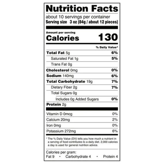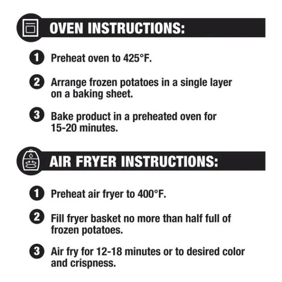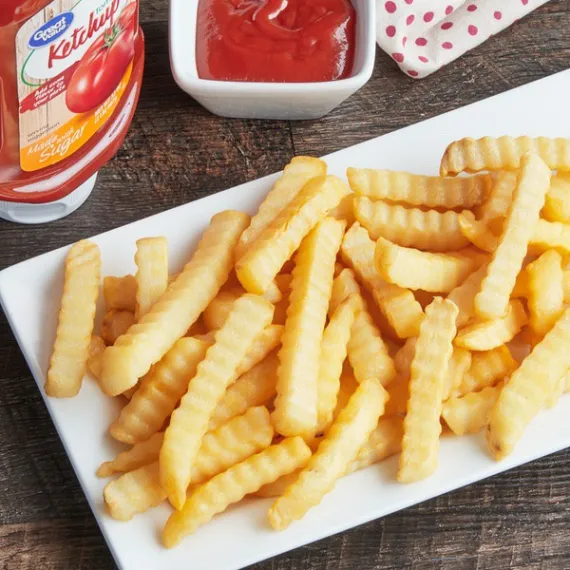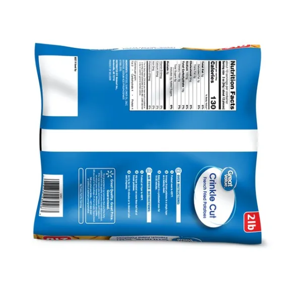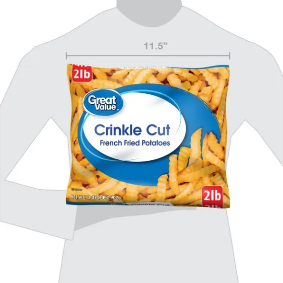 Details Ingredients POTATOES, VEGETABLE OIL (SOYBEAN, CANOLA, COTTONSEED, AND/OR SUNFLOWER), CONTAINS LESS THAN 2% OF COLOR (ANNATTO EXTRACT, CARAMEL COLOR, TURMERIC OLEORESIN), DEXTROSE, SALT, DISODIUM DIHYDROGEN PYROPHOSPHATE (TO MAINTAIN NATURAL COLOR). Show more Product features Serve up a crisp side dish with these Great Value Crinkle Cut French Fries. This 32-oz bag is the ideal size to prepare for your family meals. These crinkle cut fries have no trans fats or artificial flavors, so you can feel good about serving them at dinnertime and other social gatherings. This favorite side dish can be served with burgers, pizza and many more of your favorite main courses. You can even enjoy these French fried potatoes by themselves for a quick snack that you can dunk in your favorite dipping sauces. They have the starchy taste you want and can be served salted or unsalted. Kids will enjoy these Great Value crinkle cut French fries because they have a classic taste that they crave. The guarantee is that you'll be fully satisfied with the taste and quality of every Great Value product. If for any reason you're not happy, we'll replace it or return your money, whichever you prefer. All you need is the package and the receipt. It's that simple. Great Value Crinkle Cut French Fried Potatoes, 32 oz: French Fried Potatoes, Crinkle Cut 0 g trans fat per serving. No artificial flavors. Product of USA. Special Features No trans fat Net Quantity of Content ABOUT 11 X 3 oz