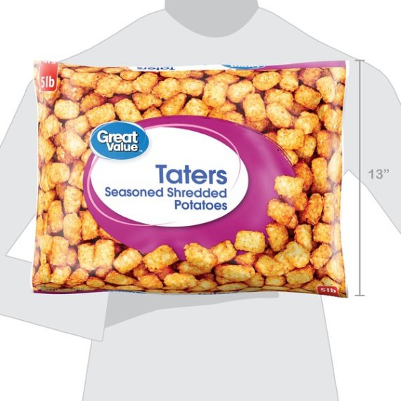 Details Ingredients POTATOES VEGETABLE OIL (CONTAINS ONE OR MORE OF THE FOLLOWING: CANOLA, PALM, SOYBEAN, SUNFLOWER), SALT, CORN FLOUR, DEHYDRATED POTATO, ONION POWDER, SPICE, DISODIUM DIHYDROGEN PYROPHOSPHATE (TO PROMOTE COLOR RETENTION), DEXTROSE. Show more Product features Great Value Taters are a quick and easy way to make a delicious side item for your next meal. These potatoes are shredded and seasoned with the perfect amount of spices. Heat them in a toaster or conventional oven for a crispy, tasty treat. You could serve them alongside a cheeseburger, or bake them into a comforting casserole. Heat up your deep fryer or air fryer and cook some taters to go along with your freshly caught catfish. Our taters have no trans fat or artificial flavors. This five-pound bag of frozen taters is sure to please everyone in the family. The possibilities are endless and delicious with Great Value Taters. Great Value products provide families with affordable, high-quality grocery and household consumable options. With our wide range of product categories spanning grocery and household consumables, we offer you a variety of products for your family's needs. Our products are conveniently available online and in Walmart stores nationwide, allowing you to stock up and save money at the same time. Great Value Frozen Taters, Seasoned Shredded Potatoes, 80 oz: Contains shredded, seasoned potatoes Perfect side for any meal Great with ketchup or ranch No trans fat No artificial flavors 5 lb bag of frozen taters Special Features No trans fat Net Quantity of Content ABOUT 27 X 3 oz