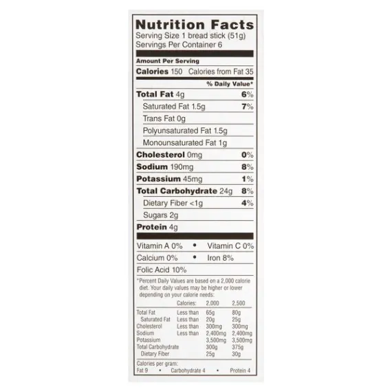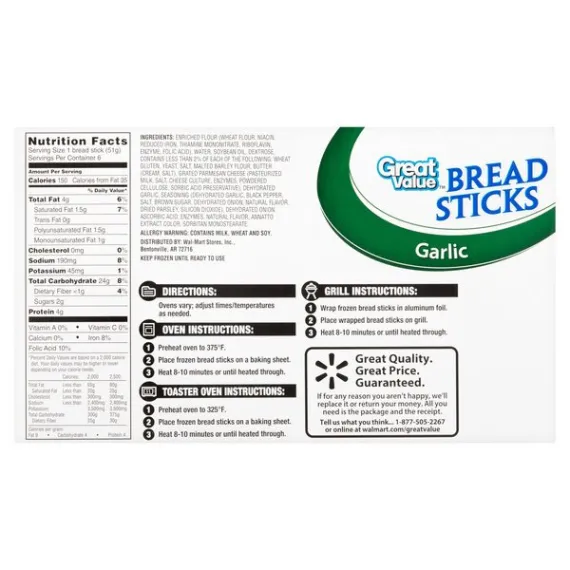 Details Ingredients ENRICHED FLOUR (WHEAT FLOUR, NIACIN, REDUCED IRON, THIAMINE MONONITRATE, RIBOFLAVIN, ENZYME, FOLIC ACID), WATER, SOYBEAN OIL, DEXTROSE, CONTAINS LESS THAN 2% OF EACH OF THE FOLLOWING: WHEAT GLUTEN, SALT, YEAST, CALCIUM SULFATE, BUTTER (CREAM, SALT), DEHYDRATED GARLIC, PARMESAN CHEESE (PASTEURIZED MILK, SALT, CHEESE CULTURE, ENZYMES, POWDERED CELLULOSE, SORBIC ACID PRESERVATIVE), SEASONING (DEHYDRATED GARLIC, BLACK PEPPER, SALT, BROWN SUGAR, DEHYDRATED BELL PEPPER, DEHYDRATED ONION, NATURAL FLAVOR, DRIED PARSLEY, SILICON DIOXIDE), DEHYDRATED ONION, ASCORBIC ACID ADDED AS A DOUGH CONDITIONER, ENZYMES, CALCIUM PHOSPHATE, NATURAL FLAVOR, SOYBEAN OIL, ANNATTO EXTRACT COLOR. Show more Product features Great Value Garlic Bread Sticks are a great and easy way to add more flavor to your next home cooked meal. Ready to serve in only 10 minutes, our buttery breadsticks have the perfect amount of garlic baked into each bite. Serve them alongside your favorite pasta, salad or steak for a satisfying meal the family is sure to appreciate. You could take them to your next potluck or serve them as a delicious appetizer at your next dinner party. Bring home a treat the entire family will enjoy with our Great Value Garlic Bread Sticks. Great Value products provide families with affordable, high quality grocery and household consumable options. With our wide range of product categories spanning grocery and household consumables, we offer you a variety of products for your family's needs. Our products are conveniently available online and in Walmart stores nationwide, allowing you to stock up and save money at the same time Great Value Garlic Bread Sticks, 10.5 oz, 6 Count Perfect addition to your next home cooked meal Frozen to last longer Great with pasta, salad or steak Ready in 10 minutes Easy cooking instructions provided right on the pack Net Quantity of Content 6 X 50 g