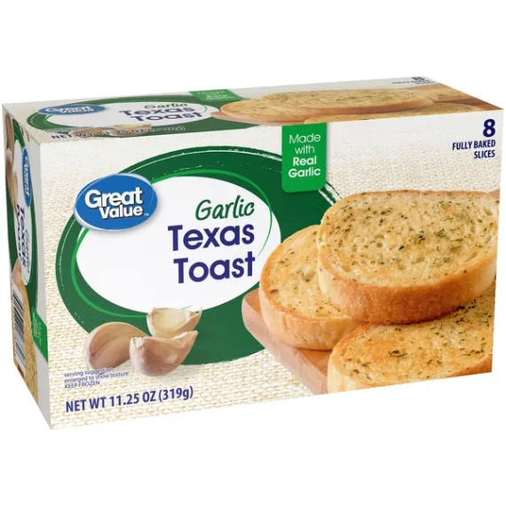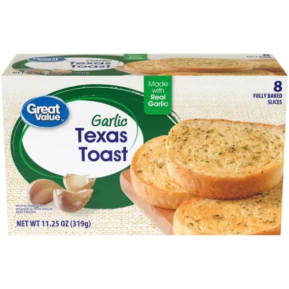 Details Ingredients BREAD: ENRICHED WHEAT FLOUR (FLOUR, NIACIN, REDUCED IRON, THIAMINE MONONITRATE, RIBOFLAVIN, FOLIC ACID), WATER, SOYBEAN OIL, YEAST, SUGAR, SALT, CALCIUM PROPIONATE (PRESERVATIVE), ENZYMES, ASCORBIC ACID. SPREAD: SOYBEAN OIL, WATER, PALM OIL, DEHYDRATED GARLIC, SALT, MONOGLYCERIDES OF FATTY ACIDS, NATURAL FLAVORS, CRUSHED GARLIC (GARLIC, CITRIC ACID [PRESERVATIVE]), DEHYDRATED PARSLEY, WHEY POWDER, SOY LECITHIN, BETA-CAROTENE COLOR. Show more Product features Enjoy a mouthful of warm garlic bread with Great Value Garlic Texas Toast. These thick, pre-sliced Texas Toast pieces are the perfect addition to your next meal. They are made with real garlic and will leave your taste buds wanting more. This Garlic Texas Toast is easy to warm up in the oven or in a toaster. Its warm garlic taste is sure to leave a smile on everyone's face. Serve with some roasted chicken and salad for a wholesome dinner. This box comes with eight slices so there is plenty for everyone. Add some excitement to your dinner table with Great Value Garlic Texas Toast. Great Value products provide families with affordable, high-quality grocery and household consumable options. With our wide range of product categories spanning grocery and household consumables, we offer you a variety of products for your family's needs. Our products are conveniently available online and in Walmart stores nationwide, allowing you to stock up and save money at the same time. Great Value Garlic Texas Toast, 11.25 oz, 8 Count: Pre-sliced Made with real garlic Contains 8 fully baked slices Easily cooks in the oven or toaster oven Special Features 0G trans fat per serving Net Quantity of Content 8 X 40 g