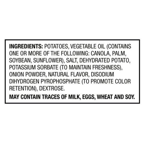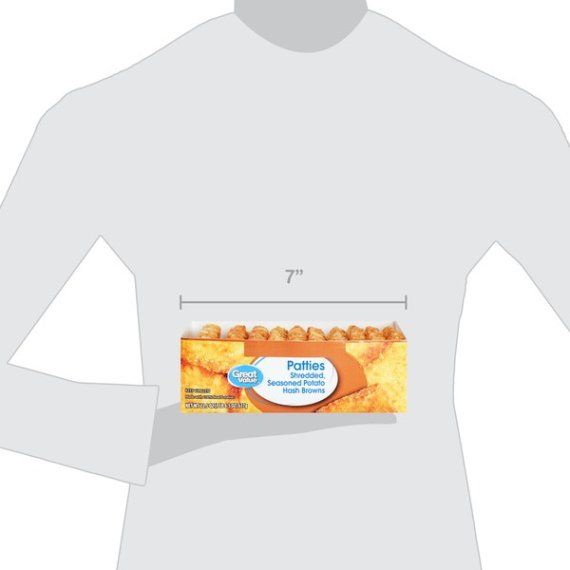 Details Ingredients POTATOES, VEGETABLE OIL (CONTAINS ONE OR MORE OF THE FOLLOWING: CANOLA, PALM, SOYBEAN, SUNFLOWER), SALT, DEHYDRATED POTATO, POTASSIUM SORBATE (TO MAINTAIN FRESHNESS), ONION POWDER, NATURAL FLAVOR, DISODIUM DIHYDROGEN PYROPHOSPHATE (TO PROMOTE COLOR RETENTION), DEXTROSE. Show more Product features Great Value Potato Hash Brown Patties are a great and easy way to make a delicious breakfast side. These fully cooked potato hash browns can be served with your typical American breakfast fare, including pancakes, waffles, eggs, or even French toast. You could also serve these crispy hash browns with your favorite sandwich. All you need is a microwave, and these perfectly seasoned hash browns are ready in 1-1 ½ minutes. The hash browns come in an easy to open package that is convenient and maintains freshness. Be prepared for your next delicious meal with Great Value Potato Hash Brown Patties. Great Value products provide families with affordable, high quality grocery and household consumable options. With our wide range of product categories spanning grocery and household consumables, we offer you a variety of products for your family's needs. Our products are conveniently available online and in Walmart stores nationwide, allowing you to stock up and save money at the same time Great Value Potato Hash Brown Patties, Shredded, 1 lb 6.5 oz, 10 Count Contains shredded, seasoned potatoes Delicious for breakfast Fully cooked Ready in 1-1 ½ minutes May be cooked in an oven, microwave or stovetop Special Features No trans fat Net Quantity of Content 10 X 64 g