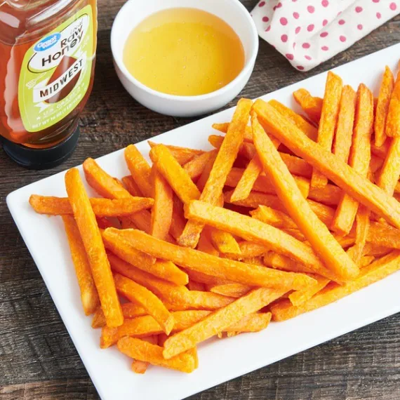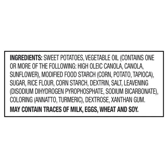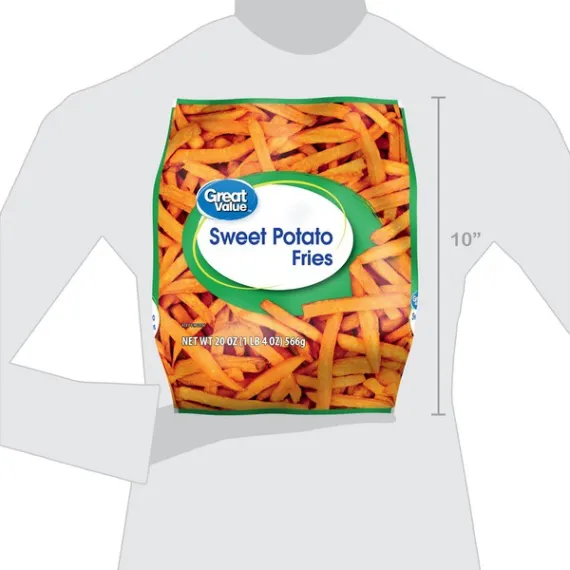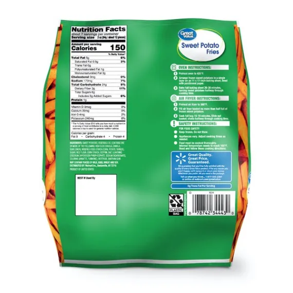 Details Ingredients SWEET POTATOES, VEGETABLE OIL (CONTAINS ONE OR MORE OF THE FOLLOWING: HIGH OLEIC CANOLA, CANOLA, SUNFLOWER), MODIFIED FOOD STARCH (CORN, POTATO, TAPIOCA), SUGAR, RICE FLOUR, CORN STARCH, DEXTRIN, SALT, LEAVENING (DISODIUM DIHYDROGEN PYROPHOSPHATE, SODIUM BICARBONATE), COLORING (ANNATTO, TURMERIC), DEXTROSE, XANTHAN GUM. Show more Product features Great Value Sweet Potato Fries are a flavorful take on a side-item favorite. Sweet potatoes are known for their sweeter flavor in comparison to the traditional potato, and these sweet potato fries deliver the same sweet, mouth-watering taste with all the salty goodness you love about the classic French fry. These fries are fantastic crowd-pleasing snacks and side dishes for barbeques, parties and for watching the big game. Fire up the grill and serve these crispy fries with a juicy hamburger or a tender steak or serve them alongside a gourmet grilled cheese sandwich or crunchy chicken tenders. With the option to cook them in the oven, deep fryer or air fryer, you can an enjoy a sweet, crispy treat any way you want. For an easy and delicious side try Great Value Sweet Potato Fries. Great Value products provide families with affordable, high-quality grocery and household consumable options. With our wide range of product categories spanning grocery and household consumables, we offer you a variety of products for your family's needs. Our products are conveniently available online and in Walmart stores nationwide, allowing you to stock up and save money at the same time. Great Value Sweet Potato Fries, 20 oz: Made with real sweet potatoes as the first ingredient Cooks to a perfect golden brown in the oven, deep fryer or air fryer Great side dish for dinners with the family or dinner parties 6 servings per container 0g trans fat Keep frozen until ready to cook Special Features No trans fat Net Quantity of Content 2-3" PIECES X 3 oz
