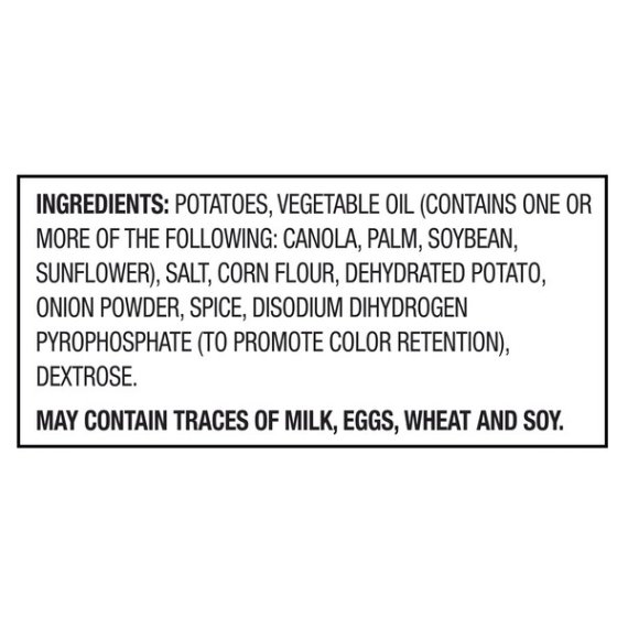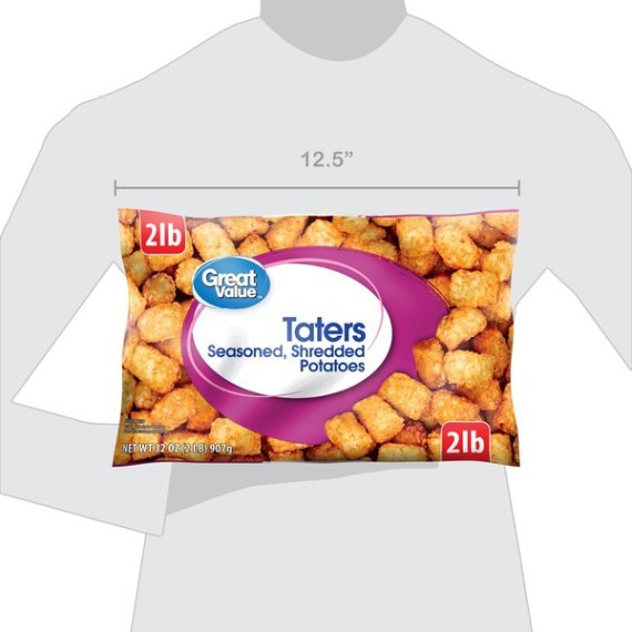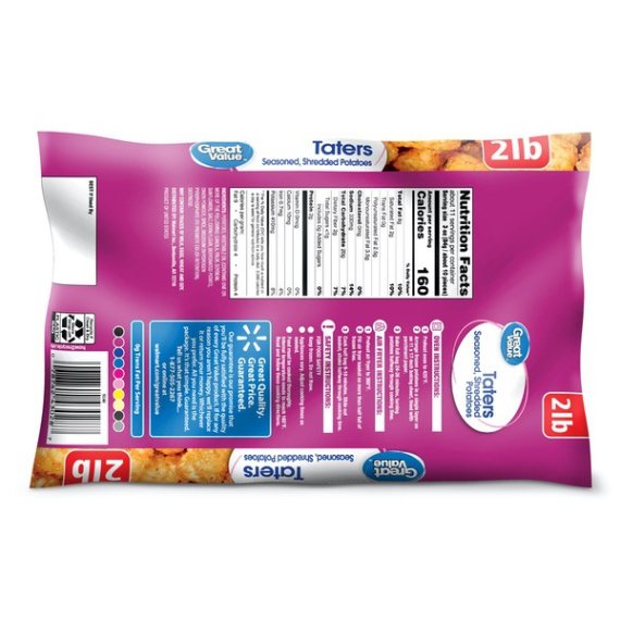 Details Ingredients POTATOES, VEGETABLE OIL (CONTAINS ONE OR MORE OF THE FOLLOWING: CANOLA OIL, CORN OIL, COTTONSEED OIL, PALM OIL, SOYBEAN OIL, SUNFLOWER OIL), SALT, CORN FLOUR, DEHYDRATED POTATO, ONION POWDER, SPICE, DISODIUM DIHYDROGEN PYROPHOSPHATE (TO PROMOTE COLOR RETENTION), DEXTROSE. Show more Product features Great Value Taters are a quick and easy way to make a delicious side item for your next meal. These potatoes are shredded and seasoned with the perfect amount of spices. Heat them in a toaster or conventional oven for a crispy, tasty treat. You could serve them alongside a cheeseburger, or bake them into a comforting casserole. Heat up your deep fryer and cook some taters to go along with your freshly caught catfish. Our taters have no trans fat or artificial flavors. The possibilities are endless and delicious with Great Value Taters. Great Value products provide families with affordable, high quality grocery and household consumable options. With our wide range of product categories spanning grocery and household consumables, we offer you a variety of products for your family's needs. Our products are conveniently available online and in Walmart stores nationwide, allowing you to stock up and save money at the same time Great Value Taters, 32 oz: Contains shredded, seasoned potatoes Perfect side for any meal Great with ketchup No trans fat No artificial flavors Special Features No trans fat Net Quantity of Content ABOUT 11 X 3 oz