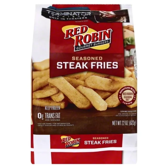 Details Ingredients POTATOES, VEGETABLE OIL (CONTAINS ONE OR MORE OF THE FOLLOWING: CANOLA OIL, CORN OIL, COTTONSEED OIL, PALM OIL, SOYBEAN OIL, SUNFLOWER OIL), MODIFIED FOOD STARCH (CORN POTATO, TAPIOCA), RICE FLOUR, SALT, DEXTRIN, SPICES, LEAVENING (DISODIUM DIHYDROGEN PYROPHOSPHATE, SODIUM BICARBONATE), GRANULATED GARLIC, YEAST EXTRACT, GRANULATED ONION, TOMATO POWDER, DEXTROSE, NATURAL FLAVOR, OLEORESIN PAPRIKA, XANTHAN GUM, ANNATTO (COLOR). Show more Product features Steak Fries, Seasoned, Bag 22 OZ Signature blend. Red Robin seasoning salt. Yummm. Gourmet burgers and brews. 0 g trans fat per serving. See side panel for nutrition information. Serving quality since 1969. For over 40 years, Red Robin has been serving its famous gourmet burgers, bottomless steak fries and towering onion rings seasoned with our signature blend Red Robin seasoning salt. Known as the gourmet burger authority, Red Robin offers unique and delicious gourmet burgers and other craveable entrees. You can take the great taste of Red Robin restaurants home and serve our world famous steak fries anytime. Sorry, you'll have to serve yourself, our wait staff won't fit on the grocery shelf. www.redrobin.com. Connect with us! Visit RedRobin.com. Facebook: facebook.com/RedRobin. Twitter: twitter.com/RedRobinBurgers. YouTube: youtube.com/RedRobinBurgers. Have a question or comment? Call us at 1-866-518-0137. Pleae have entire package available when you call. Product of USA. Keep frozen. Cooking Instructions: Keep frozen. Do not thaw. Appliances vary. Adjust cooking times as needed. Food must be cooked thoroughly. Internal temperature needs to reach 165 degrees F as measured by a food thermometer in several spots. Read and follow these cooking directions. Do not overcook. Preheat oven to 425 degrees. Arrange: Scatter frozen fries in a single layer on an 11 inch x 17 inch baking sheet. Bake 22-26 mins for 1/2 bag, 30-34 mins for full bag. Bake to a light golden color flipping halfway through cooking time. Dip into one of our signature sauces. See recipes on back. 22 oz (1.37 lb) 623 g 8701 W. Gage Blvd. Kennewick, WA 99336 866-518-0137 2017 Red Robin International, Inc. Steak Fries, Seasoned Signature blend. Red Robin seasoning salt. Yummm. Gourmet burgers and brews. 0 g trans fat per serving. See side panel for nutrition information. Serving quality since 1969. For over 40 years, Red Robin has been serving its famous gourmet burgers, bottomless steak fries and towering onion rings seasoned with our signature blend Red Robin seasoning salt. Known as the gourmet burger authority, Red Robin offers unique and delicious gourmet burgers and other craveable entrees. You can take the great taste of Red Robin restaurants home and serve our world famous steak fries anytime. Sorry, you'll have to serve yourself, our wait staff won't fit on the grocery shelf. www.redrobin.com. Connect with us! Visit RedRobin.com. Facebook: facebook.com/RedRobin. Twitter: twitter.com/RedRobinBurgers. YouTube: youtube.com/RedRobinBurgers. Have a question or comment? Call us at 1-866-518-0137. Pleae have entire package available when you call. Product of USA. Net Quantity of Content ABOUT 7 X 3 oz