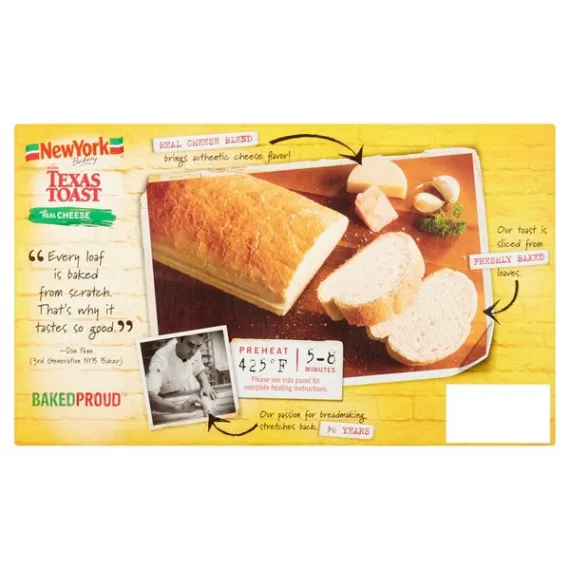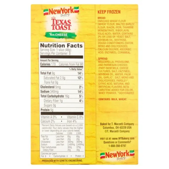 Details Ingredients BREAD: ENRICHED WHEAT FLOUR (WHEAT FLOUR, NIACIN, REDUCED IRON, THIAMINE MONONITRATE, RIBOFLAVIN, FOLIC ACID), WATER, CONTAINS 2% OR LESS OF: SALT, YEAST, SOYBEAN OIL, DEXTROSE, ASCORBIC ACID (VITAMIN C), CORNMEAL. SPREAD: MOZZARELLA, PROVOLONE, AND PARMESAN CHEESES (PART-SKIM MILK, CHEESE CULTURES, SALT, ENZYMES), SOYBEAN OIL, WATER, SALT, GARLIC*, PALM AND/OR HYDROGENATED COTTONSEED OIL, MONO AND DIGLYCERIDES, NATURAL FLAVOR, PARSLEY*, CITRIC ACID, YEAST EXTRACT, WHEY, BETA CAROTENE ADDED FOR COLOR. Show more Product features The Original Texas Toast with Real Cheese "Every loaf is baked from scratch. That's why it tastes so good." -Don Penn (3rd Generation NYB Baker) Real Cheese Blend brings authentic cheese flavor! Our toast is sliced from Freshly Baked loaves. Our passion for breadmaking stretches back 90 Years. Texas Toast, with Real Cheese The original thick slice. 0 grams trans fat. No preservatives. Ready in 4-5 minutes. What could make America's Best Selling Texas Garlic Toast even better? How about adding Real Mozzarella, Real Parmesan, and Real Provolone Cheeses on top of our garlic and herb spread! Ready in just 4-5 minutes, New York Brand Texas Toast with Cheese makes a great complement to any meal - or a great snack! Our Beginnings: Over 50 years ago, the Penn family moved their small family bakery from New York to Cleveland and continued to specialize in the crusty, chewy-textured, hearth-baked breads that are still popular in Europe today. Over time, the Penn family created the New York Brand line of Texas Toasts, Garlic Knots, Breadsticks, Garlic Loaves, and Ciabatta Rolls that have become favorites across the US. 100% recycled paperboard. Please recycle. Visit us at: www.newyorkfrozen.com. Special Features 8 slices Net Quantity of Content 8 X 48 g