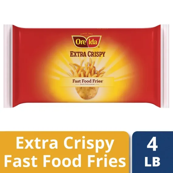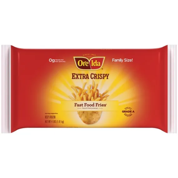 Details Ingredients Potatoes, Vegetable Oil Blend (Soybean And Cottonseed), Modified Food Starch, Rice Flour, Salt, Dextrin, Corn Starch, Annatto Color, Sodium Acid Pyrophosphate, Dextrose, Leavening (Sodium Acid Pyrophosphate, Sodium Bicarbonate), Xanthan Gum. Show more Product features Ore-Ida Extra Crispy Fast Food Fries make it easy to enjoy delicious fast food style fries at home. Crispy and golden, these Grade A fries are made from freshly peeled, American grown potatoes. These gluten free fries offer an extra crispy outside with a fluffy inside for the perfect blend of textures to make your next family meal a success. Toss these frozen fries on a baking sheet to bake them in the oven according to package instructions for perfectly crispy fries every time. An American classic, these easy fries are cut thin and straight like fast food fries for extra crispness and are perfect for dipping. Serve these fries with the traditional burger, or get creative with loaded fries topped with cheese and bacon. These oven baked fries come sealed in a 4 pound bag to help lock in flavor. Your family deserves the highest quality because if it's not Grade A, it's not Ore-Ida! One 4 lb. bag of Ore-Ida Extra Crispy Fast Food Fries Ore-Ida Extra Crispy Fast Food Fries offer an easy side dish for your meals Gluten free French fries Made from the highest quality Grade A potatoes grown in the U.S. Classic straight cut shape adds to the crispness and is perfect for dipping in ketchup Enjoy the classic burger and fries combo Sealed in a bag for convenient storage in your freezer Special Features Fast food style Net Quantity of Content 21.0 X 3 oz (84g/about 27 pieces)