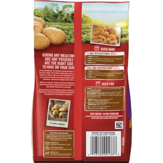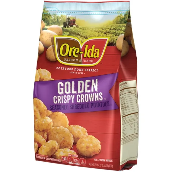 Details Ingredients Potatoes, Vegetable Oil Blend (Soybean And Cottonseed), Salt, Dextrose, Yellow Corn Flour, Sodium Acid Sulfate, Sodium Acid Pyrophosphate, Granulated Onion, Autolyzed Yeast Extract, Natural Flavor. Show more Product features Ore-Ida Golden Crispy Crowns make it easy to enjoy delicious crispy potatoes at home. Crispy and golden, these Grade A seasoned potatoes are made from freshly peeled, American grown potatoes. These gluten free Crispy Crowns offer a crispy outside with a fluffy inside for the perfect blend of textures to make your next family meal a success. Toss these frozen potatoes on a baking sheet to bake them in the oven according to package instructions for perfect golden potatoes. An American classic, these easy fried potatoes are perfect for dipping. Serve them with burgers, or get creative with loaded Crispy Crowns topped with cheese and bacon. These oven baked shredded potatoes come sealed in a 30 ounce bag to help lock in flavor. Your family deserves the highest quality because if it's not Grade A, it's not Ore-Ida! One 30 oz. bag of Ore-Ida Golden Crispy Crowns Ore-Ida Golden Crispy Crowns offer an easy side dish for your meals Gluten free seasoned potatoes Made from the highest quality Grade A potatoes grown in the U.S. Classic fried potatoes are perfect for dipping in ketchup Enjoy with burgers Sealed in a bag for convenient storage in your freezer Special Features Gluten free Net Quantity of Content 10.0 X 11 pieces (84g)